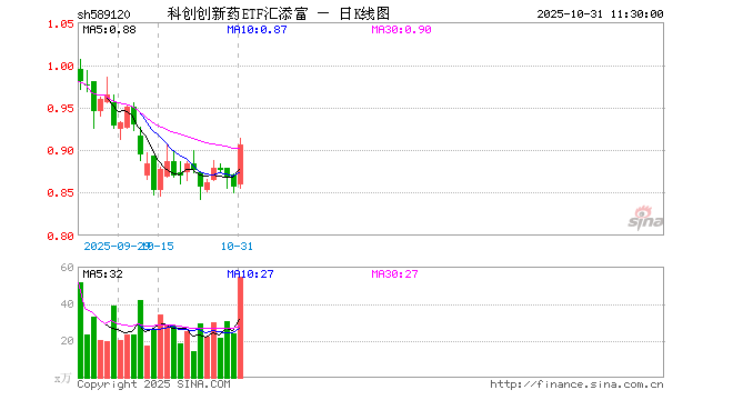 10月31日,截止午间收盘,科创创新药ETF汇添富(589120)涨5.84%,报0.906元,成交额4861.97万元。科创创新药ETF汇添富(589120)重仓股方面,百济神州截止午盘涨5.66%,百利天恒涨7.50%,博瑞医药涨8.96%,君实生物涨4.27%,艾力斯涨2.58%,泽璟制药涨12.78%,荣昌生物涨8.96%,益方生物涨10.16%,特宝生物涨1.62%,迈威生物涨10.39%。