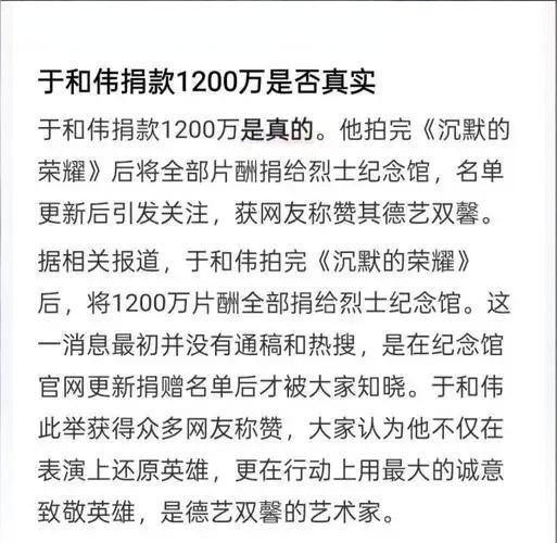 2025年10月30日,针对“于和伟捐1200万片酬给吴石烈士纪念馆”的网传消息,福州、北京多部门回应均表示未听说此事。福州暂无“吴石烈士纪念馆”,也未收到相关捐赠信息;北京方面同样未接到纪念馆筹建申报及捐赠通知。于和伟方面暂未回应。吴石烈士 于和伟 吴石英勇 于和伟演技