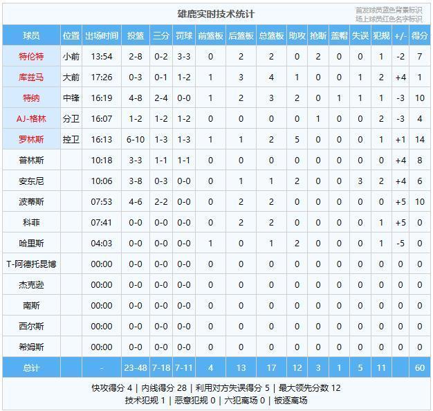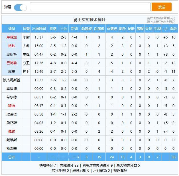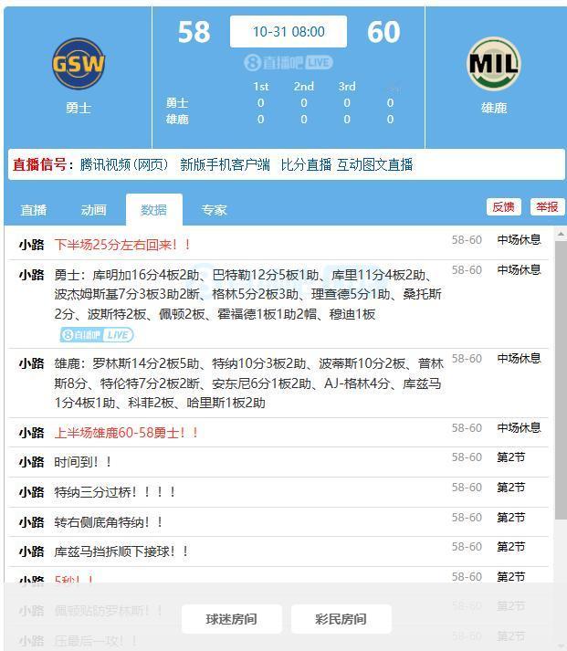 字母哥今天因为左膝酸痛不打,但勇士最喜欢输的就是这种残阵,过去几年别说二阵,连三阵都是这样输的。 半场结束,果然勇士58-60落后雄鹿。库明加已经得了16分,库里2个三分共得11分。 雄鹿方面有3人得分上双,爆冷是有可能的。