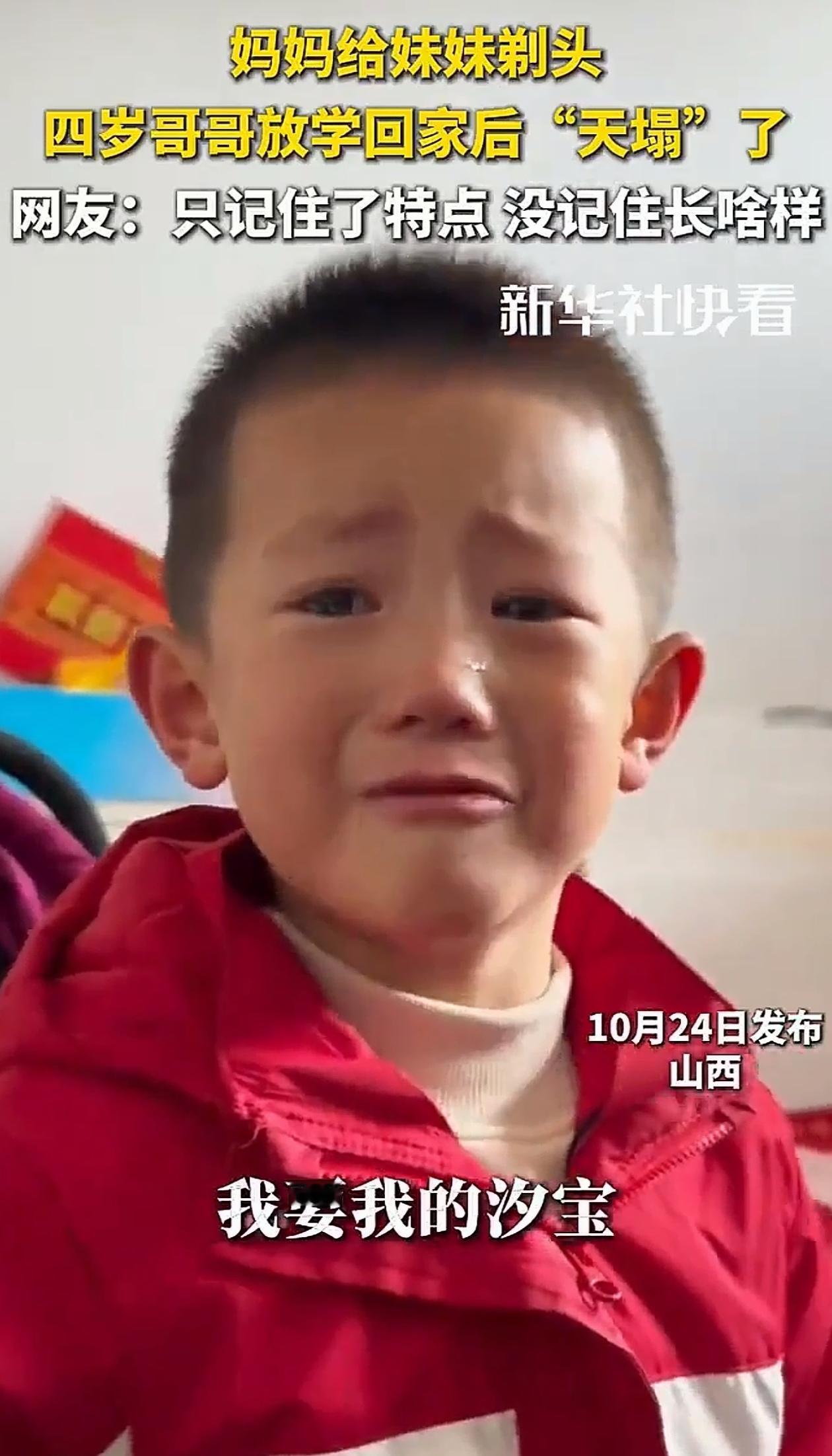 山西一位母亲给四个月大的小女儿剃了头,四岁儿子回来看到直接哭了,非说小妹妹丢了,这不是他妹妹,小表情那叫一个委屈! 妹妹剃头前还是有点头发的,可剃完头之后简直和男孩子没什么两样。 所以哥哥看到后直接哭着大喊“我要我的汐宝”,妈妈也是被这一幕弄得哭笑不得,只能说这就是汐宝啊,是你自己没认出来。 可哥哥不仅不信,还列出了许多证据,想证明这个妹妹是“假”的。 比如他说自己的妹妹会吐奶,头发也根本不是这个样子,穿的衣服还不像,更关键的是妹妹没事就喜欢吃手,这个都不吃,肯定是假的! 这一番“论证”成功把妈妈逗笑了,于是妈妈就笑着问他,那你看我现在抱的这个是男孩还是女孩。 哥哥眼里还泛着泪花,仔细打量了几眼后,说这一看就是个男孩子,而且他还扭过头去,一脸委屈的说自己的汐宝明明就是个女孩子! 有网友说,这个哥哥是真关心妹妹啊,把她的小细节都记住了。 也有网友说,虽说哥哥对妹妹挺上心,但怎么就记不住那张脸呢? 还有网友说,他家也是一儿一女,给女儿剪了头发后哥哥也是嫌弃得不行! 虽然哥哥的反应挺逗的,但不得不说,小孩子之间的感情就是纯真啊。他是担心妹妹丢了,所以才会流下眼泪。也许长大之后这件事会成为一件茶余饭后的趣事,但那份对妹妹的关爱,却值得记一辈子! 妈妈给妹妹剃头 哥哥回家“天塌”了