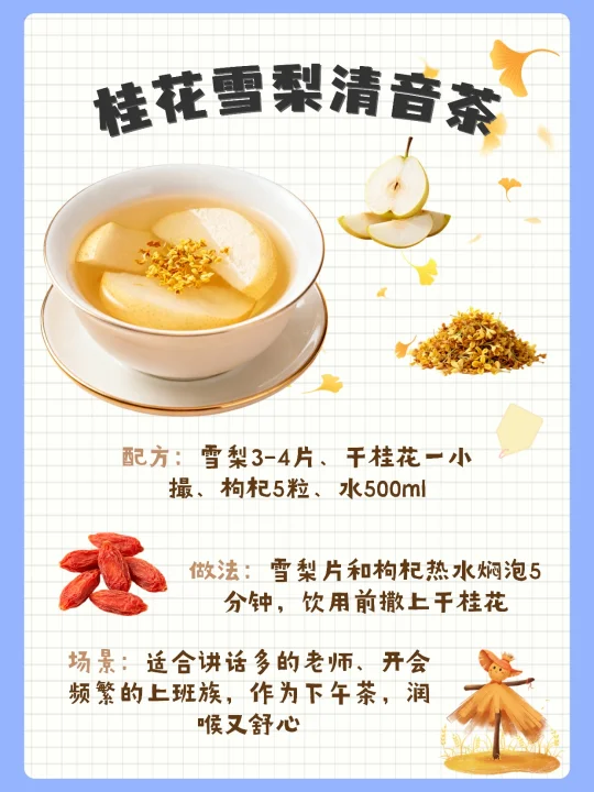 🌺桂花雪梨清音茶:梨香混合桂花香,清甜可口;能够清润喉咙,缓解秋燥