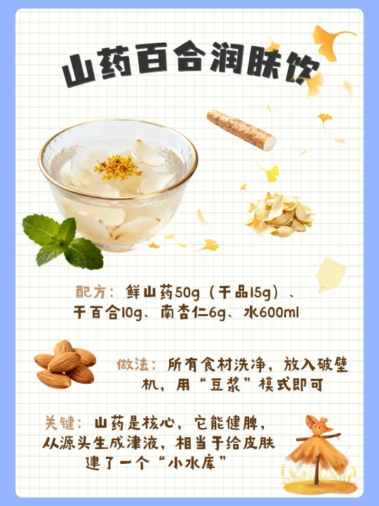 关键:山药是核心,它能健脾,从源头生成津液,相当于给皮肤建了一个“小水库”。