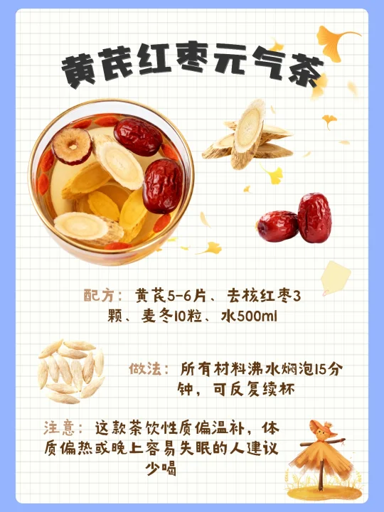 🍂黄芪红枣元气茶:枣香浓郁,带有黄芪的草本香;用于补气固表,提升能量