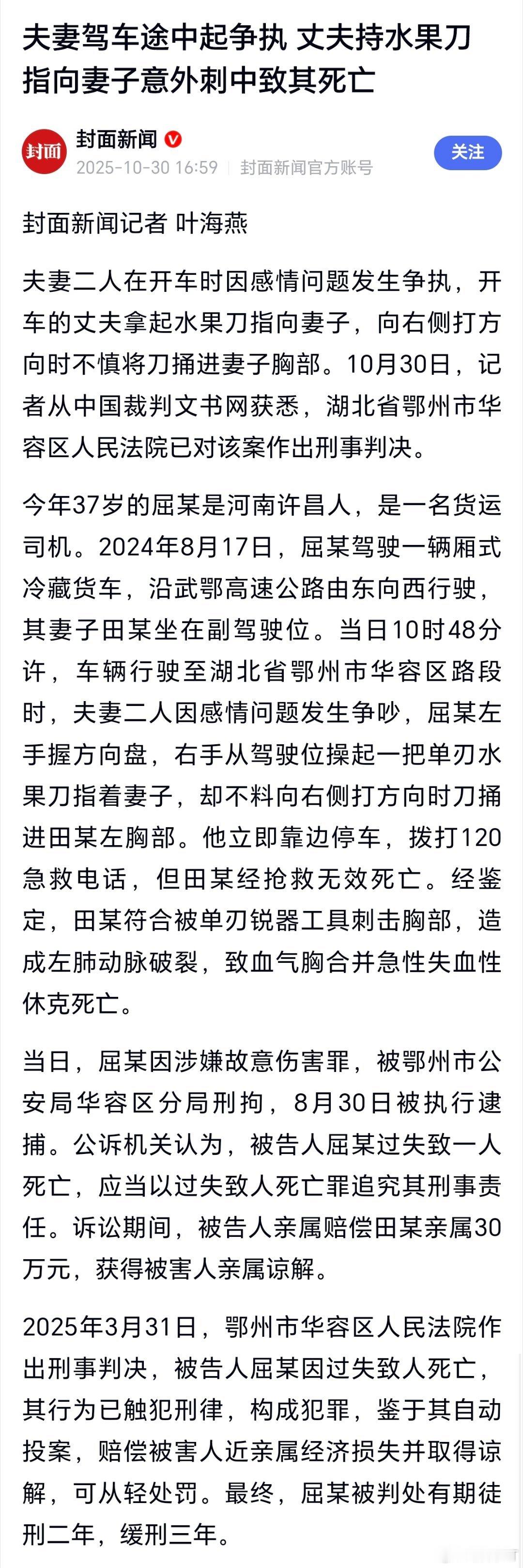 只不过,这次是夫妻发生争吵,妻子持刀误伤丈夫致死。