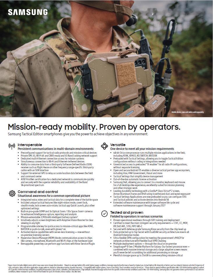 不过台湾没买 Galaxy 的战术版手机,只买了普通民用版,战术版的机身设计和规格,跟普通版完全一样,但加入了额外的软件功能和保安选项,例如在戴着夜视镜时,战术板可以允许打开或关闭手机屏幕,而不会被屏幕光致盲。而且用户可以禁用LTE并使所有RF广播静音,从而消除几乎任何被窃听的机会,听起来像是某种高级版的飞行模式。