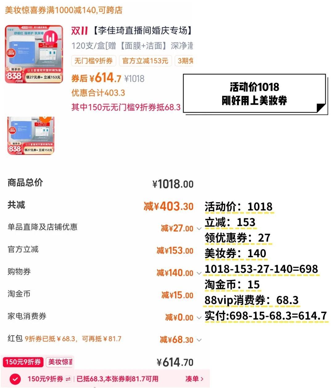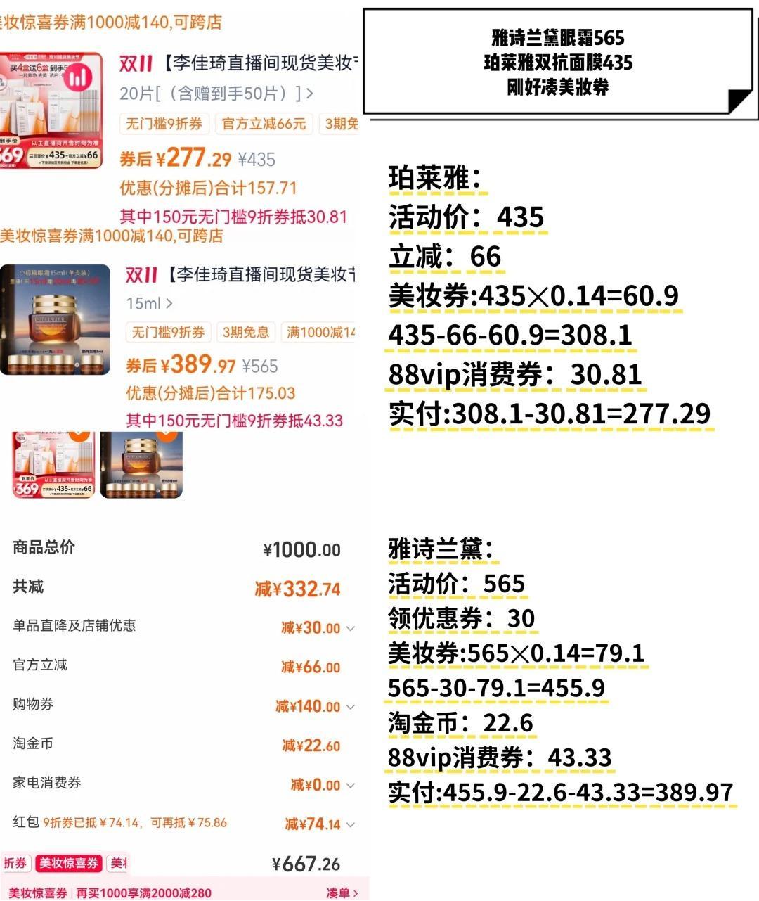 先给各位宝子直接亮出我的战绩:389拿下平常几乎不做活动的雅思兰黛眼霜。官方价格565?不怕,再凑点珀莱雅的面膜,可以叠加1000-140的美妆券,立减140相当于折上折,再加上88VIP消费券,到手这价格平时想都不敢想!还有兰蔻面霜、可复美面膜这些超好用的护肤品,实付不要太香!