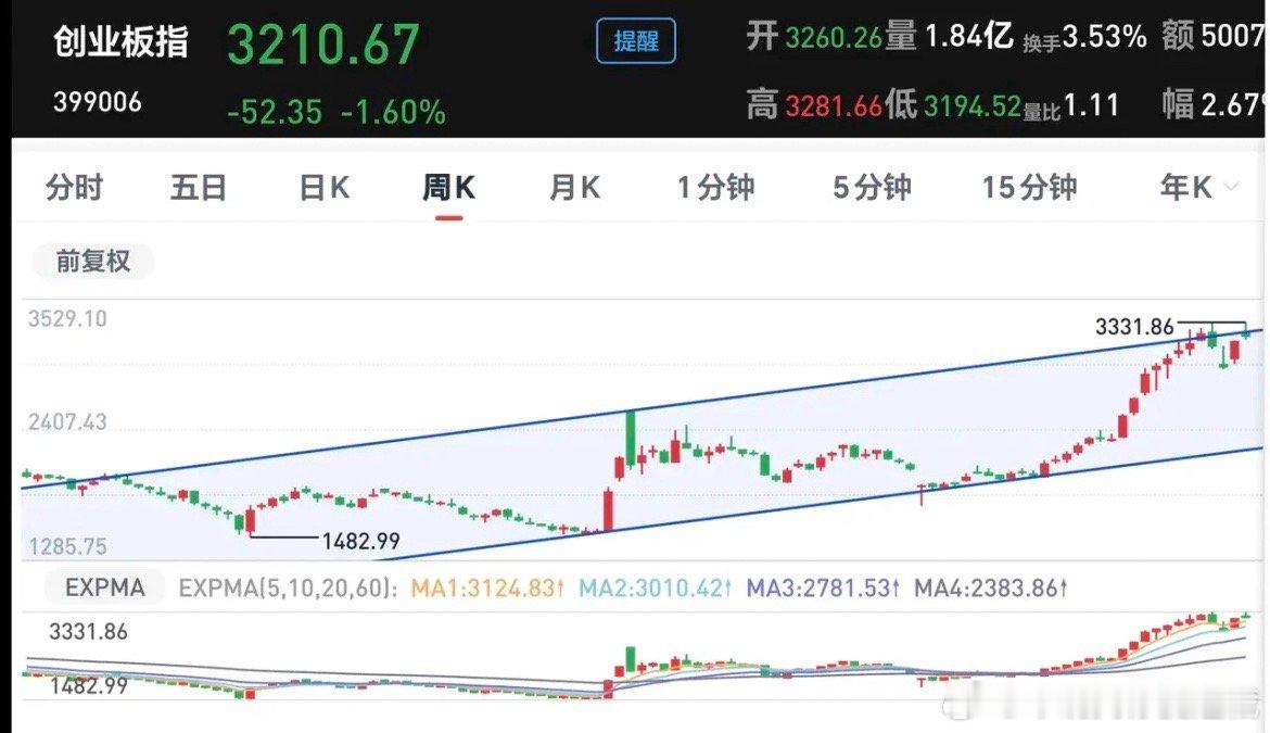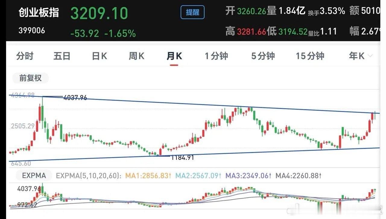 我们来看一下下面的截图13,这是创业板指的月K线图,从图中可以看出,我画了一条倾斜向下的斜线,这是长期以来的反压线,前几天指数也是突破了这条反压线,我当时说,如果成功突破这条反压线,上面的上涨空空间会打开,我还说了,是不是成功突破,需要看10月份最后一个交易日,也就是今天收盘的时候是不是突破,现在看,前几天的突破也是一个假突破,现在指数又来到了这条反压线的下方,这样的情况下,我们下个月需要继续观察能不能突破这条反压线,下个月突破这条反压线的位置,会进一步向下,因为这是一条倾斜向下的斜线。股票交流财经股票微博股票A股