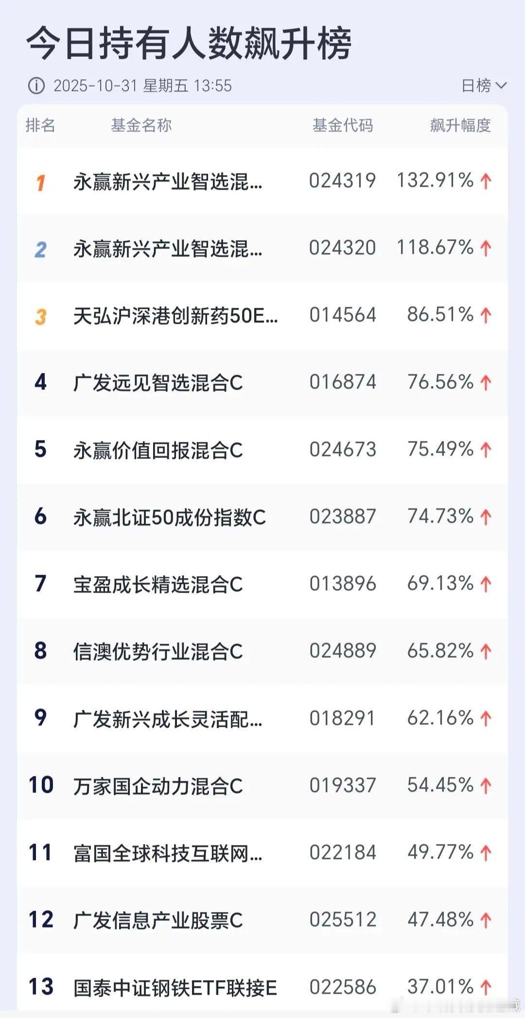 图3是今天基金的加仓排行榜,图4是今天基金的减仓排行榜,图5是今天基金的持有人数飙升榜,图6是今天基金的加仓人数和减仓人数,今天加仓9409530人,今天减仓3221426人,今天加仓人数超过了减仓人数。