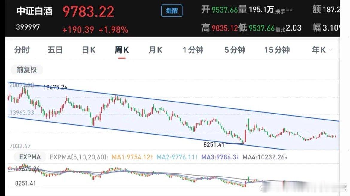 我们来看一下下面的截图9,这是白酒板块的周K线图,从图中可以看出,我画了两条倾斜向下的斜线,这是白酒板块长期以来的下跌通道线,周K线是一个大周期K线,周K线处于下跌通道中,说明大周期还是下跌趋势,这个板块今天虽然是上涨的,但距离趋势反转还很远很远,远远不及上面讲的创新药板块,上面讲的创新药板块的下跌通道是日线周期的,那只是一个小周期的下跌通道,如果你实在想进场,宁可进场创新药板块,也不可以进场白酒板块。