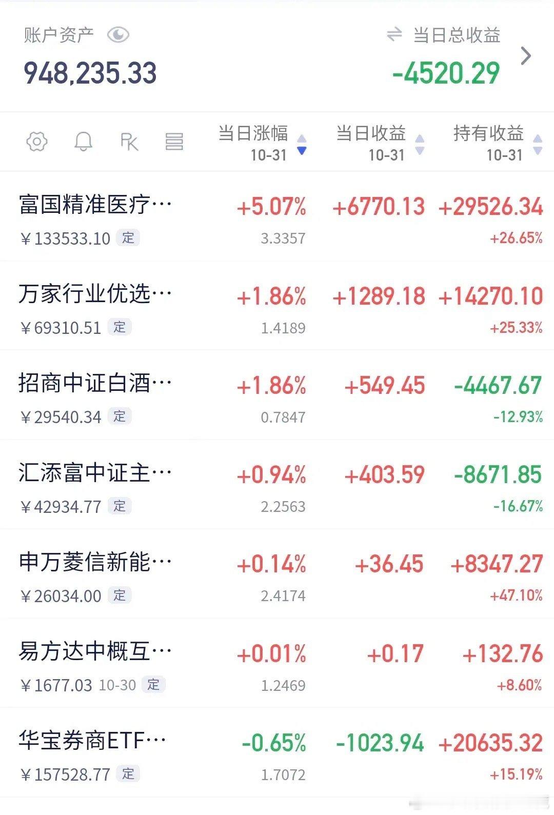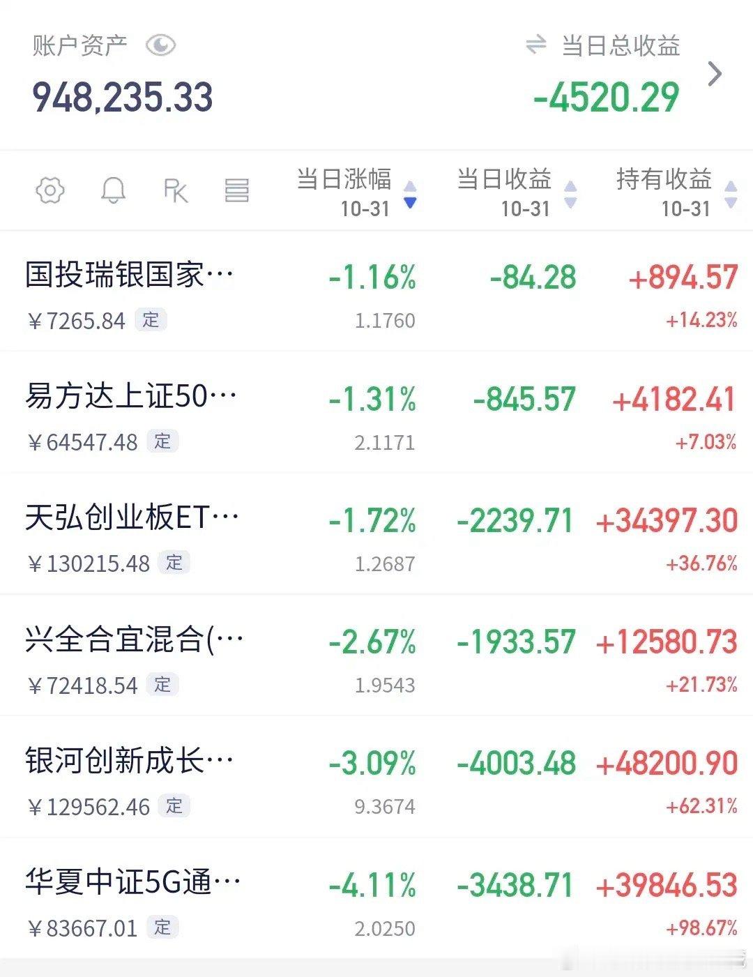 今天是本周的最后一个交易日,今天也是10月份的最后一个交易日,我10月份是亏损的,但前面的六个月份都是盈利的,六个月的连续盈利之后,来一个一个月的亏损,这是太正常不过了,欣然接受大涨带来的收益,坦然接受大跌带来的亏损,这才是正确的心态,玩基金是为了挣钱,挣钱是为了改善自己的生活,挣钱是为了让自己的心情愉悦,我们不能把玩基金作为自己的一个负担,更不能因为基金暂时的亏损而困扰,市场的调整是为了后市更好的上涨,市场后市还会站上4000点市场,后市会突破5178点,市场后市更会再创6124点新高。