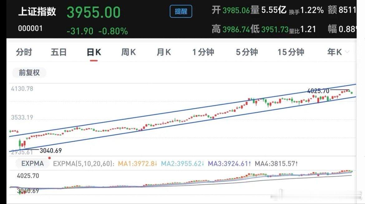 我们来看一下下面的截图7,这是上证指数的日K线图,从图中可以看出,指数虽然下跌了2个交易日,但还是在下面的那条斜线之上,也就是并没有跌破下面的那条斜线,以这两条斜线作为只有条件的人,只要不跌破下面的那条切线,就可以继续持有。