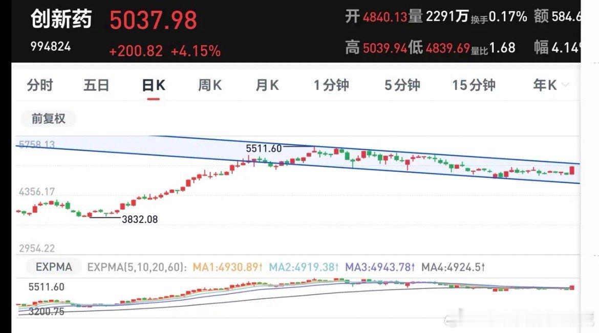 我们来看一下下面的截图8,这是创新药板块的日K线图,从图中可以看出,我画了两条倾斜向下的斜线,这是最近一段时间的下跌通道线,今天这个板块虽然是大涨,但还是在这两条斜线之间,并没有突破上面的那条斜线,只有突破了上面的那条斜线,才能考虑这个板块是不是已经反转,那个时候我们再进场不迟。