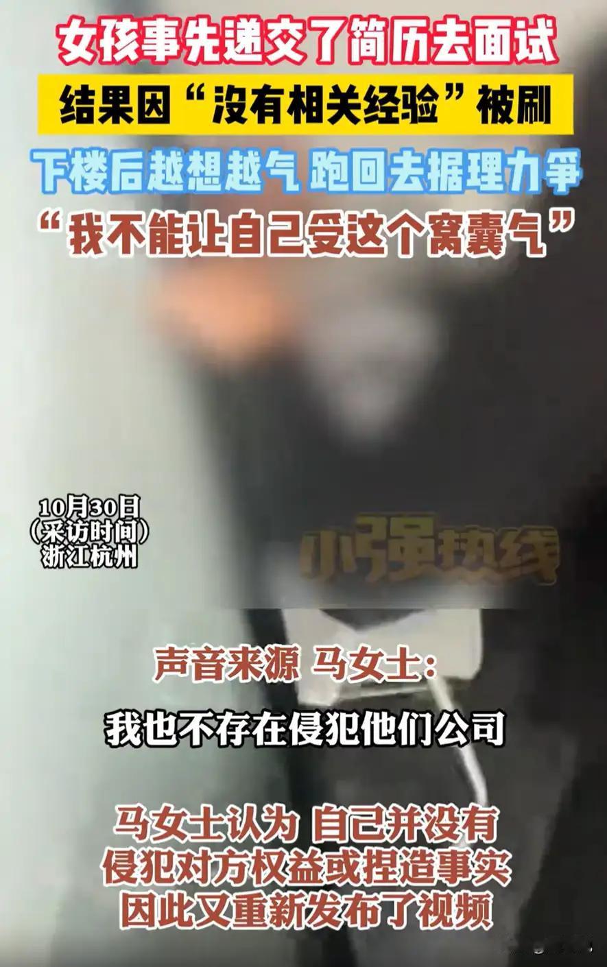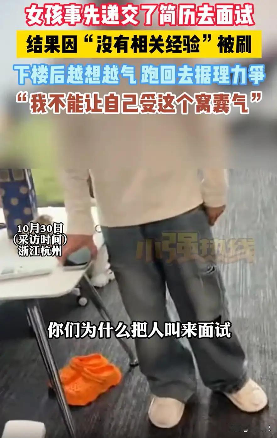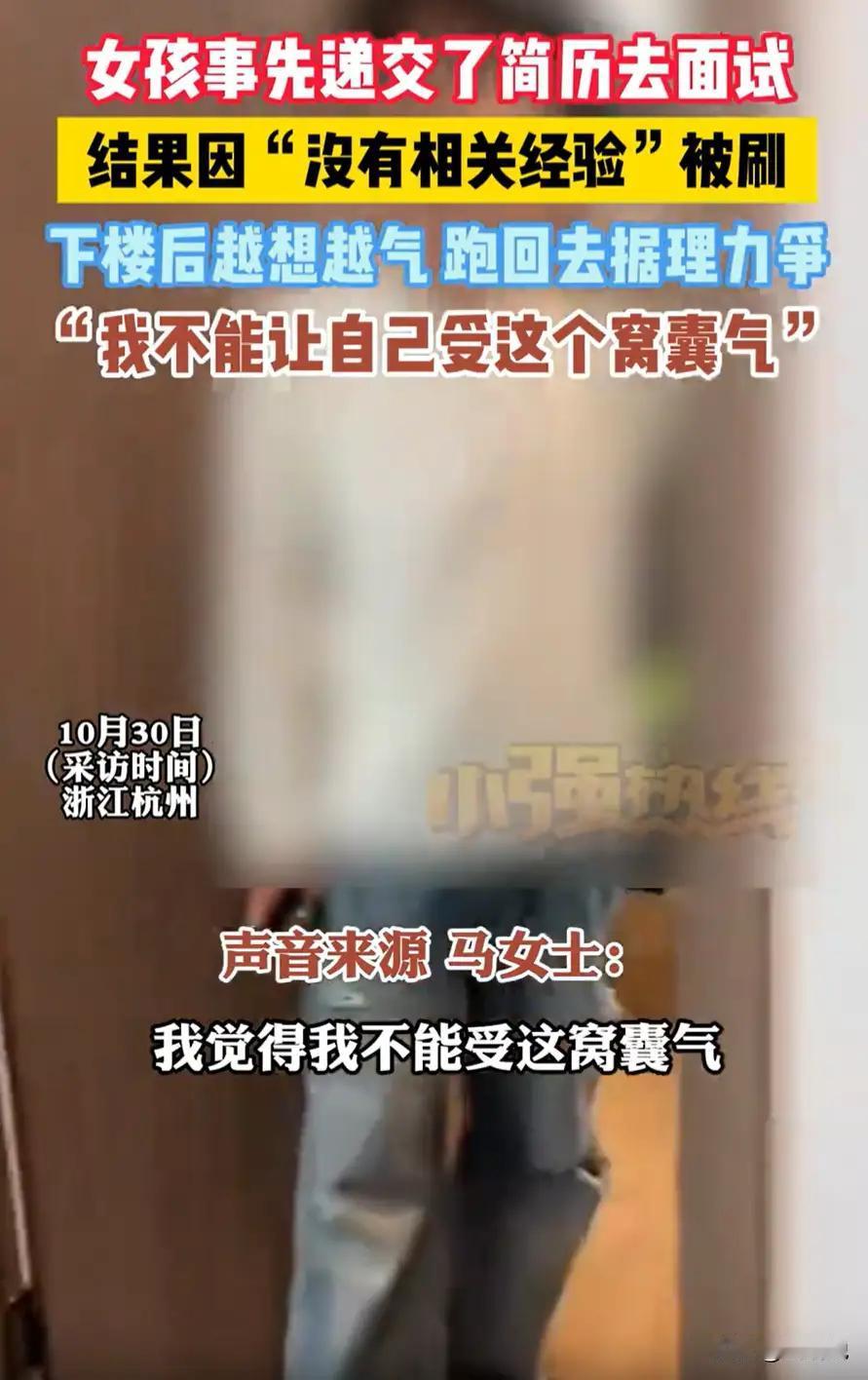 浙江杭州,女子在网上找工作,看到一个岗位还不错,就投了简历,很快接到了面试通知,可到了公司对方一听没有经验直接就把她唰掉了,女子越想越气,又返回公司来讨要说法。网友:忍一时越想越气,退一步越想越亏。 原来,这位女子在网上浏览招聘信息时,发现一家公司的岗位与自己的期望高度契合,岗位描述中并未明确标注“需相关工作经验”,她便满怀期待地投递了简历。让她惊喜的是,简历投递后不久就收到了公司的面试通知,为了这次面试,她提前做了充分准备,从了解公司业务到梳理自身优势,满心以为能在面试中展现自己的潜力。 然而,面试的过程却让她大失所望。当她抵达公司,与面试官简单交流几句,对方得知她没有相关岗位的工作经验后,态度瞬间变得冷淡,直接表示“不符合招聘要求”,连进一步了解她能力的意愿都没有,就将她“刷掉”。突如其来的拒绝让女子措手不及,起初她只是有些失落,可离开公司后越想越气愤:既然岗位对经验有硬性要求,为何不在招聘信息中注明?这不仅浪费了她的时间和精力,更让她感受到了不被尊重。 思前想后,女子决定返回公司讨要说法。面对公司工作人员,她条理清晰地表达了自己的不满:“招聘信息未提及经验要求,我才投递简历并前来面试,若早知道有经验门槛,我也不会白跑这一趟。” 网友:“忍一时越想越气,退一步越想越亏”。也有网友认为,女子的做法值得肯定,这不仅是为自己维权,也能促使企业规范招聘流程,让招聘信息更加透明。