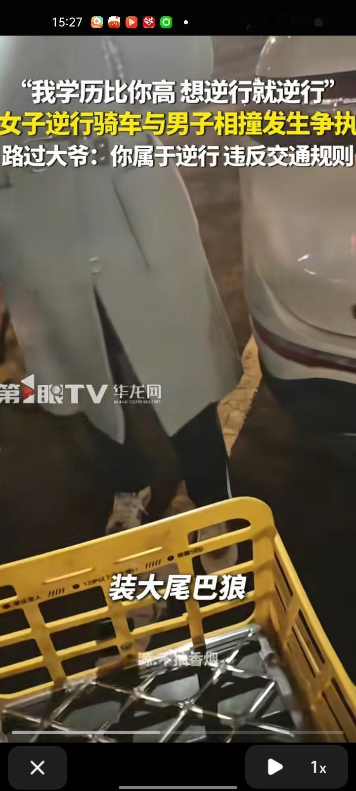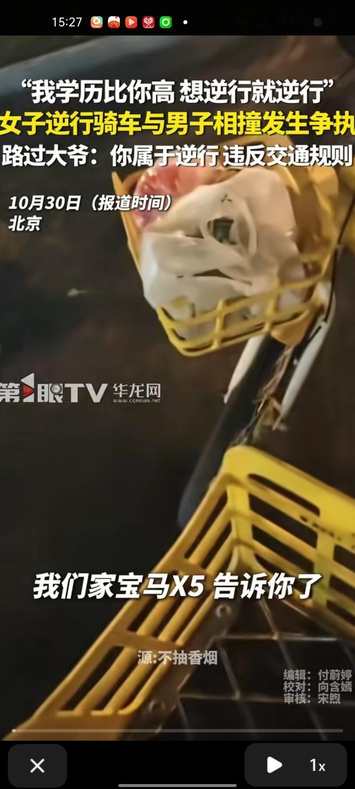 10月27日,北京。网友晒视频称,骑车途中遇到一女子逆行发生碰撞,随机发生争执,称“有学历比你高,想逆行就逆行”,一位路过大爷上前对女子劝说:此行为属于逆行,违反交通规则,可以说,女子不讲理、不懂法律、素质低下,妥妥的“三无人士”。 更过分的是,女子还对自己吐口水,然后肇事逃逸了。
