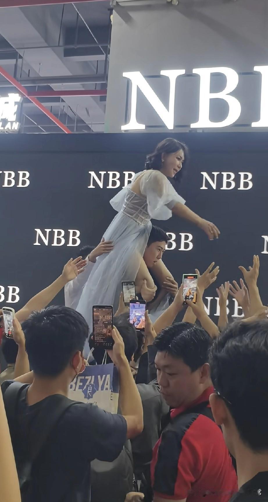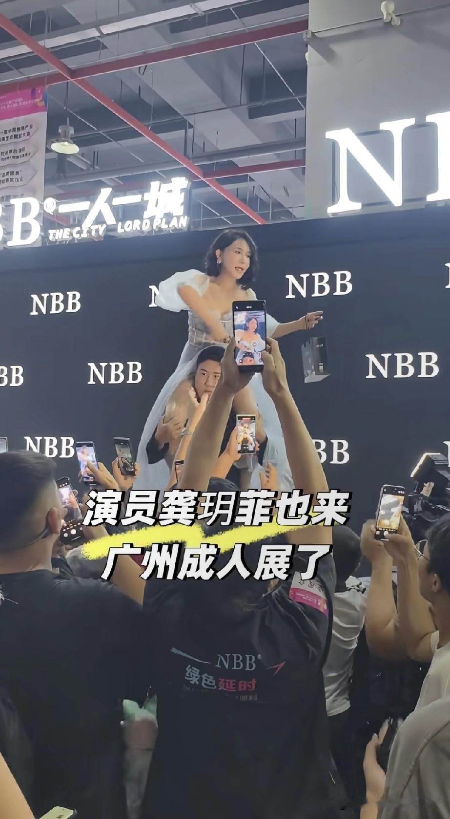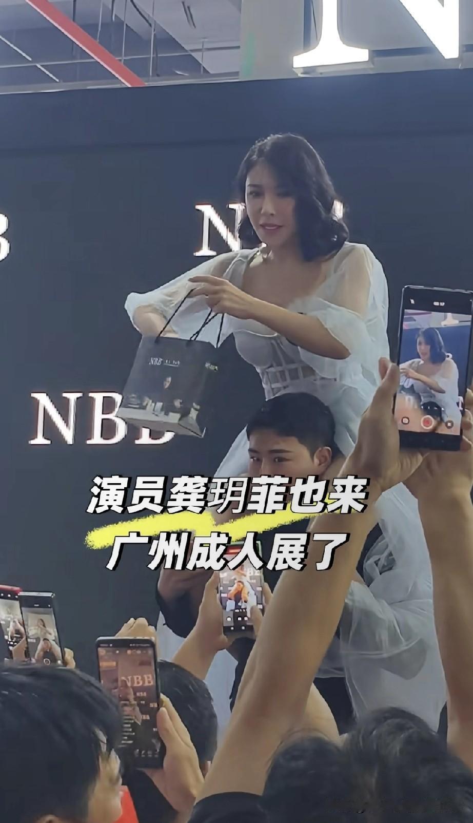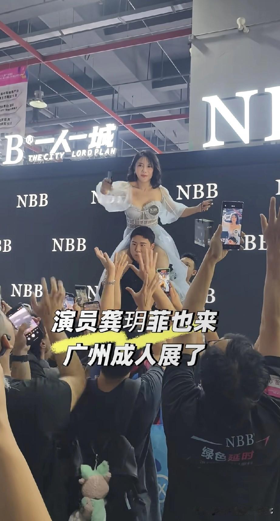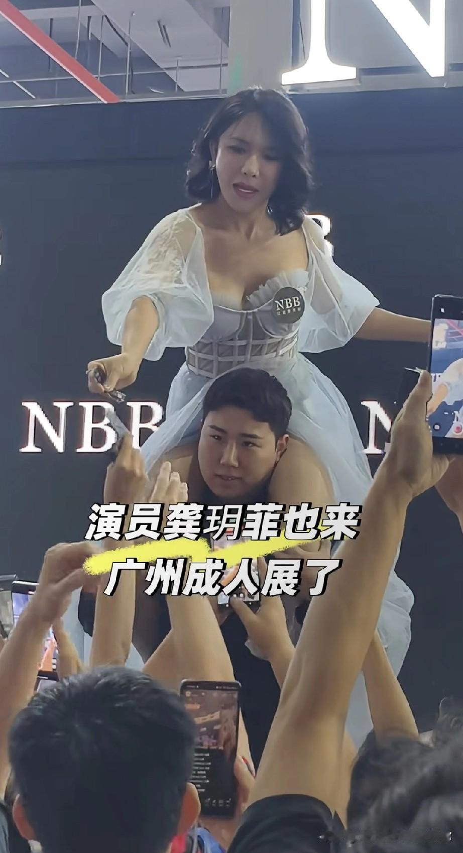 龚玥菲广州成人展被扛肩互动! 广州成人展这阵仗,龚玥菲被壮汉扛在肩头,在人群里发礼物,手机镜头都快怼脸上了。有人骂她“为了钱没底线”,可我却看到一个女人在生活里咬牙硬扛的样子。 谁不想体面地站在聚光灯下?可生活哪有那么多剧本给你挑。她穿着薄纱裙被挤在人堆里,脸上还得保持微笑,为的不就是多挣点钱养家吗? 有人说她“博眼球”,可这世上谁不是在各自的赛道里拼命呢?你觉得她这样是“放下脸面”,还是“为生活勇敢”?