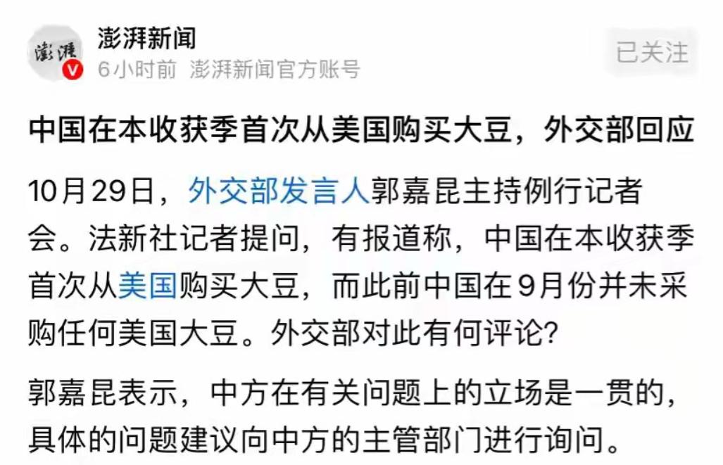 巴西傻眼了!中国突然宣布恢复采购美国大豆,双方趋势缓和;巴西豆农之前不断给中国涨价,终于品尝恶果! 中国现在的确是不仅拿捏住了美国,连巴西这个想趁机抬高豆价、坑赚中国的也被拿捏住了。一句话:都垂涎中国这个大市场! 已经给巴西机会了,就看巴西抓不住得住。美豆仅仅定了18万吨,而且还是12-1月装船,还有11月1个多月时间,如果价格回归以前,估计中国会在11月下单很大量的巴西豆,巴西如果价格还坚挺就是自找了! 给巴西人上了一课,想赚更多钱的风险,有可能亏损更多钱,大豆是农产品,非巴西独有,全球出产大豆的国家很多,谁愿意买高价大豆,大买家不多,中国的转身,意味着巴西大豆的滞销,就算再跌回到原来价格,都不一定有大买主登门购买,别把.大豆发财梦做成亏损梦,巴西该醒醒了。