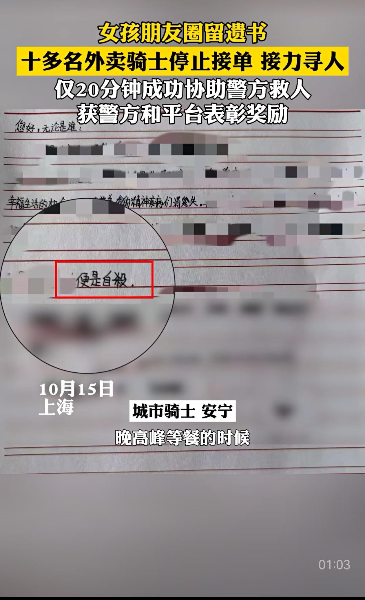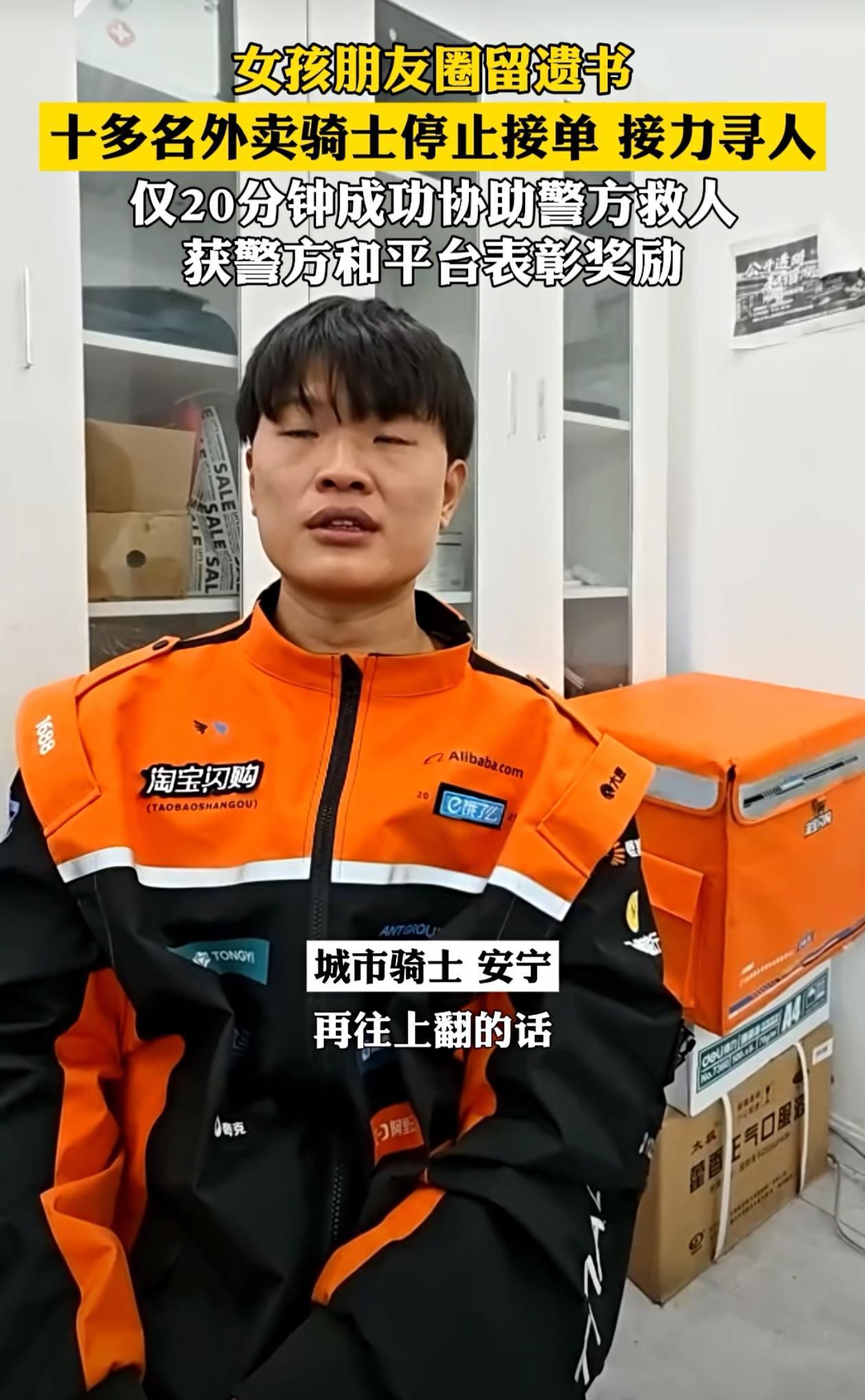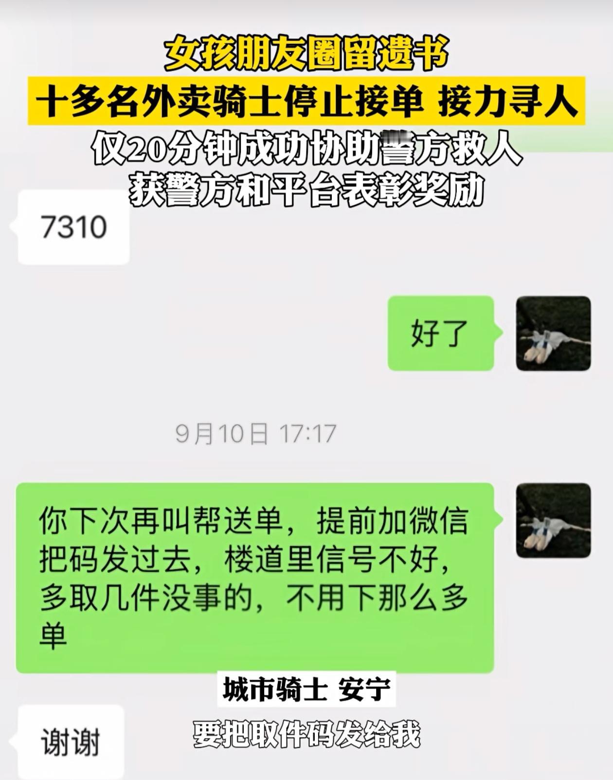 哪里是骑手?分明是骑士!上海的一个外卖骑手在等餐时刷到朋友圈,发现有个女孩的朋友圈有类似“遗书”的内容! 朋友圈没有引起朋友的重视,却被一位外卖骑手关注到,没有随意划走或犹豫,立即打电话联系女孩,没联系上后果断报警。 只知道大概地址,后又马上“多管闲事”,号召自己的一群骑士兄弟,查找历史信息,确认女孩具体住址,帮助警察找人。 一听到救人,十几号骑手立马停止接单,翻记录、转订单、直奔现场,20分钟锁定地址,快递骑手们上演了一出速度与温情的“大海捞针”!仅用20分钟,终于为警察找到了女孩的具体住址! 这名独居残障女孩最后在警察的介入和疏导下,放弃了轻生行为。事后发朋友圈,表示“不会在寻短见了”! 10月27日,骑手安宁与胡广志获警方肯定,并被授予“城市骑士社区侠”称号及现金奖励。支持这样的奖励,这样的奖励,越多越好! 真是万幸啊!女孩那条朋友圈,恰好被最该看到的人看到了,而不是被随手划走! 需要守护的人遇到了善良的人,真好! 信息来源:中国青年网