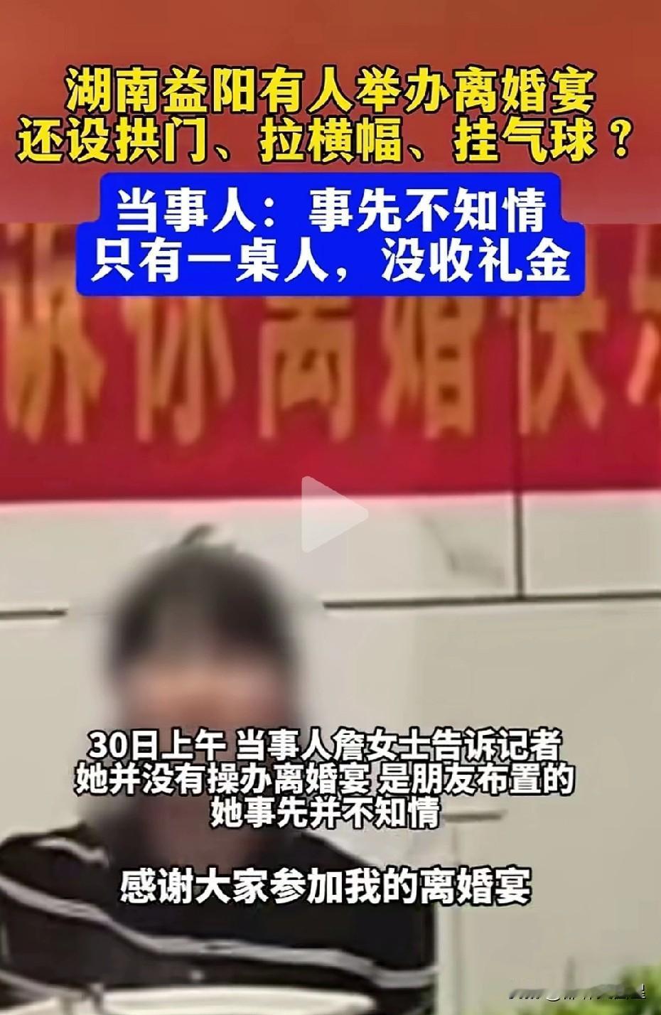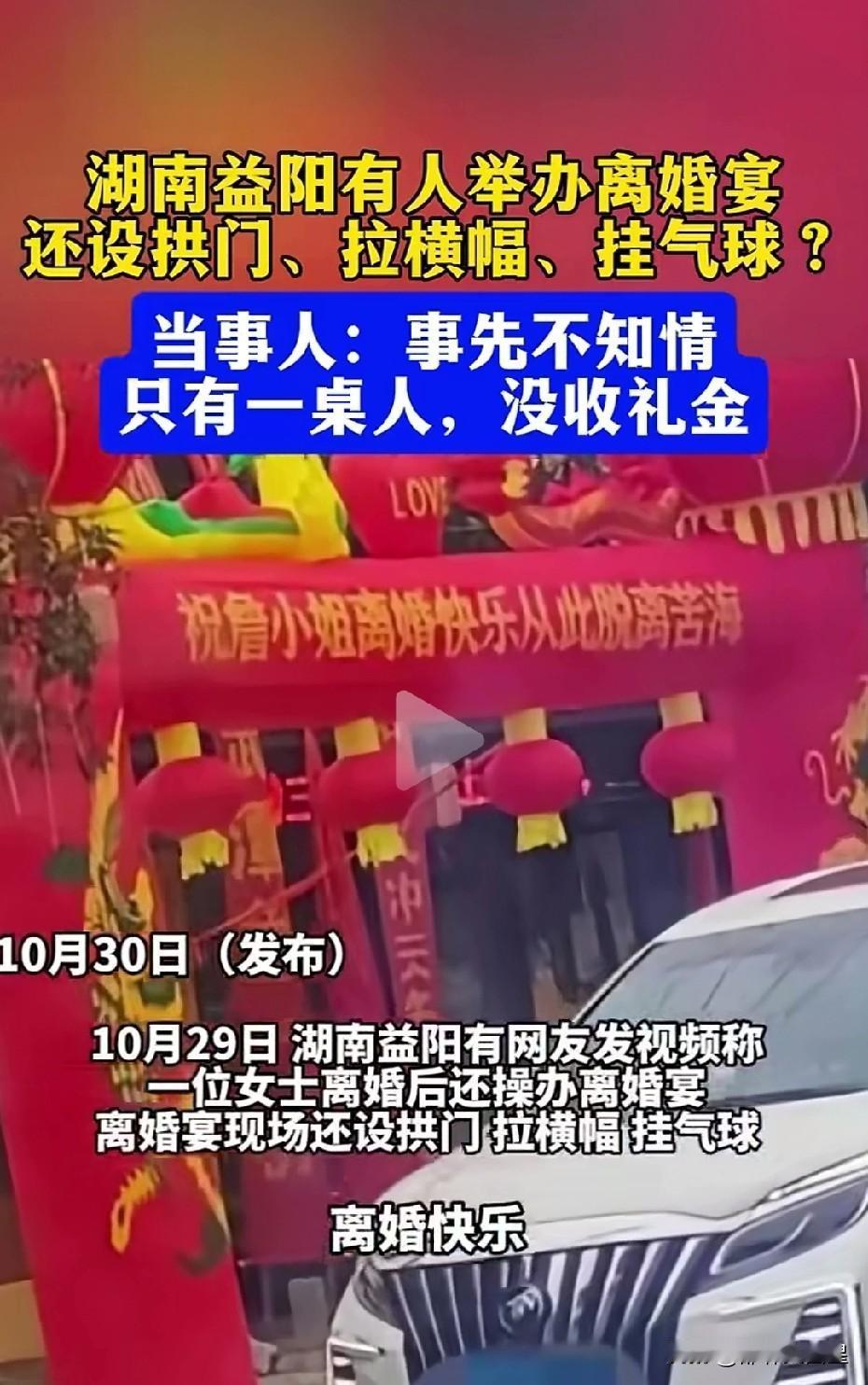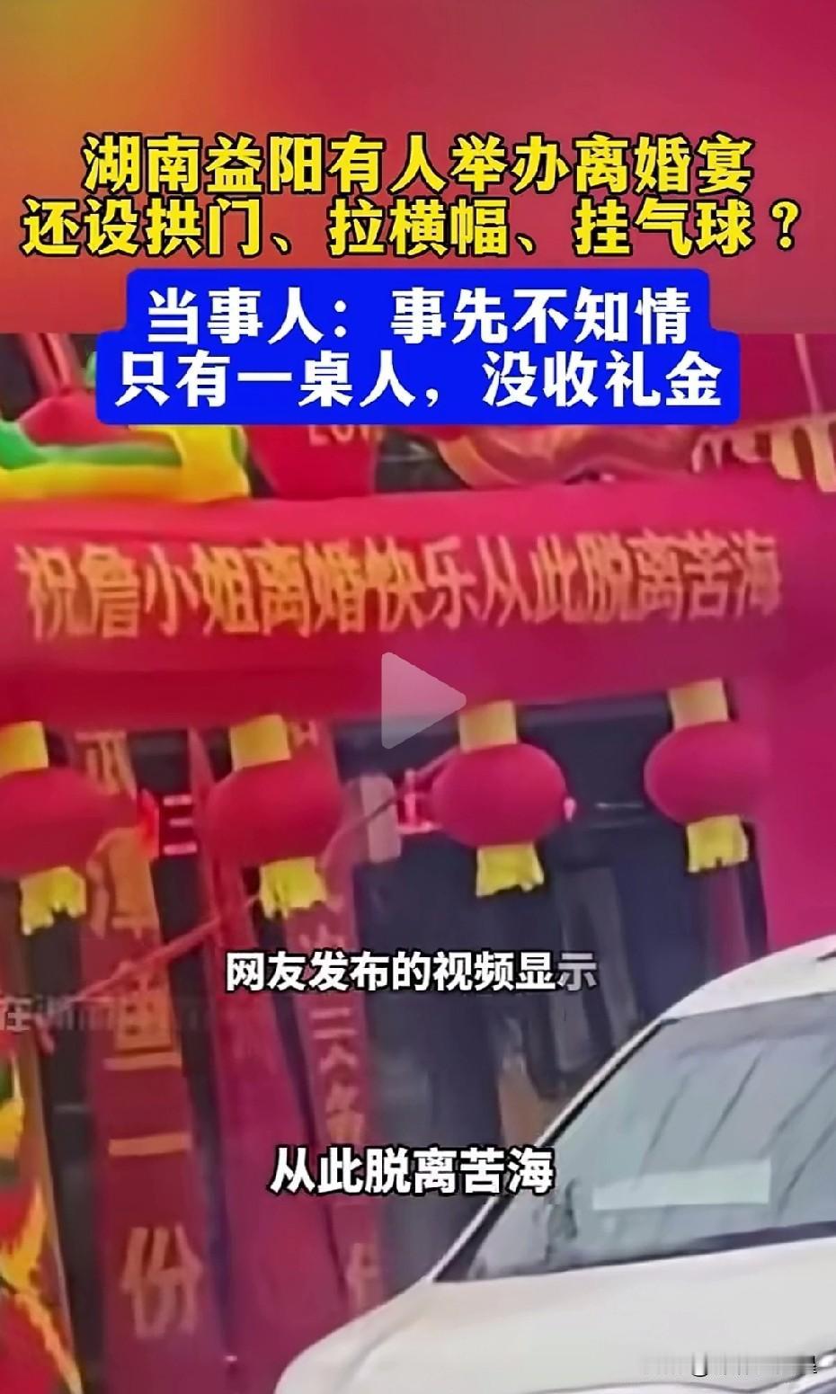 天下奇闻! 听说过生日宴,升学宴,结婚宴,从来还没有听说过离婚宴! 近日,湖南益阳,有网友发视频称,一詹姓女子离婚后还操办离婚宴,离婚宴现场还设有拱门,拉横幅,挂气球。 视频中横幅显示:祝詹小姐离婚快乐,从此脱离苦海! 真的是大千世界,无奇不有,我们知道结婚宴,生日宴等可以说结婚快乐,生日快乐!真的不理解离婚了怎么还离婚快乐? 对此,大家怎么看呢?