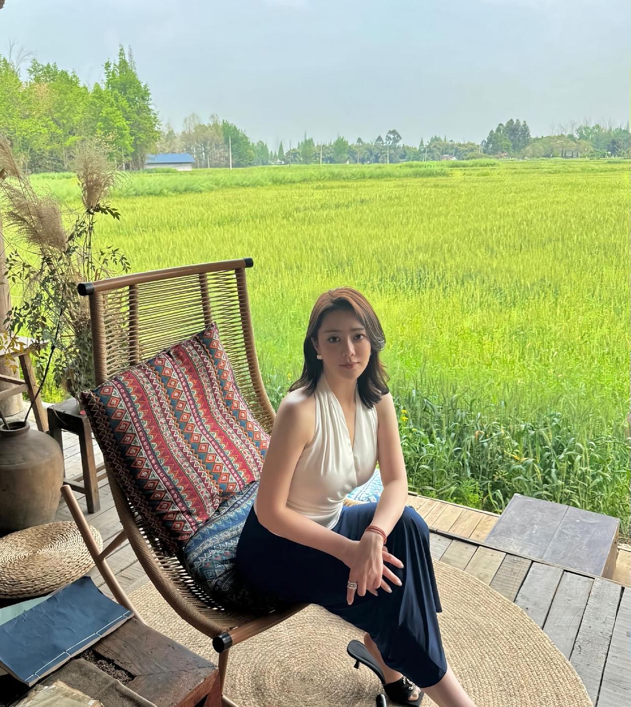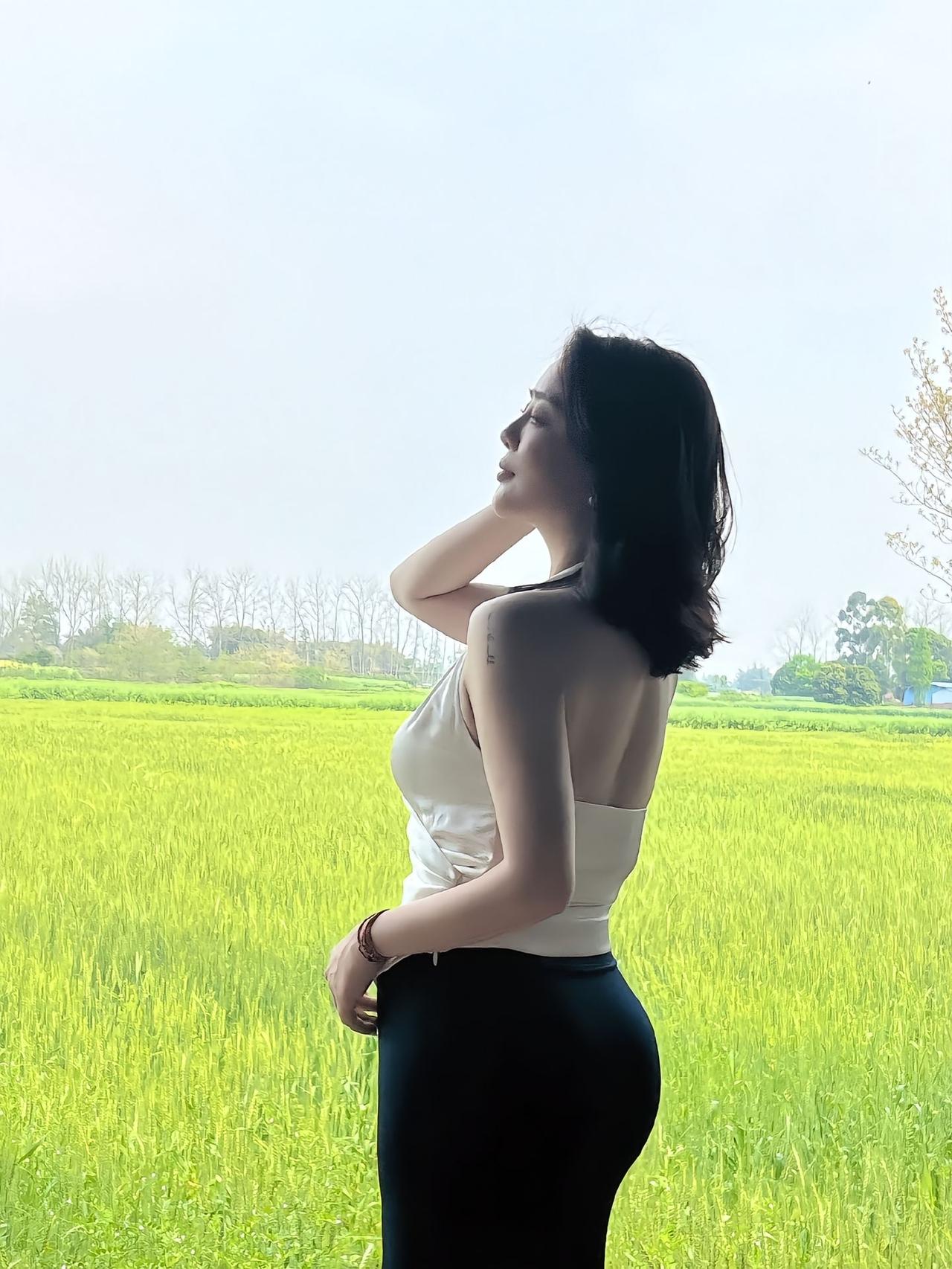 春日田园写真穿搭|缎面挂脖的精致感,与自然绿意碰撞出别样时尚田园氛围感写真