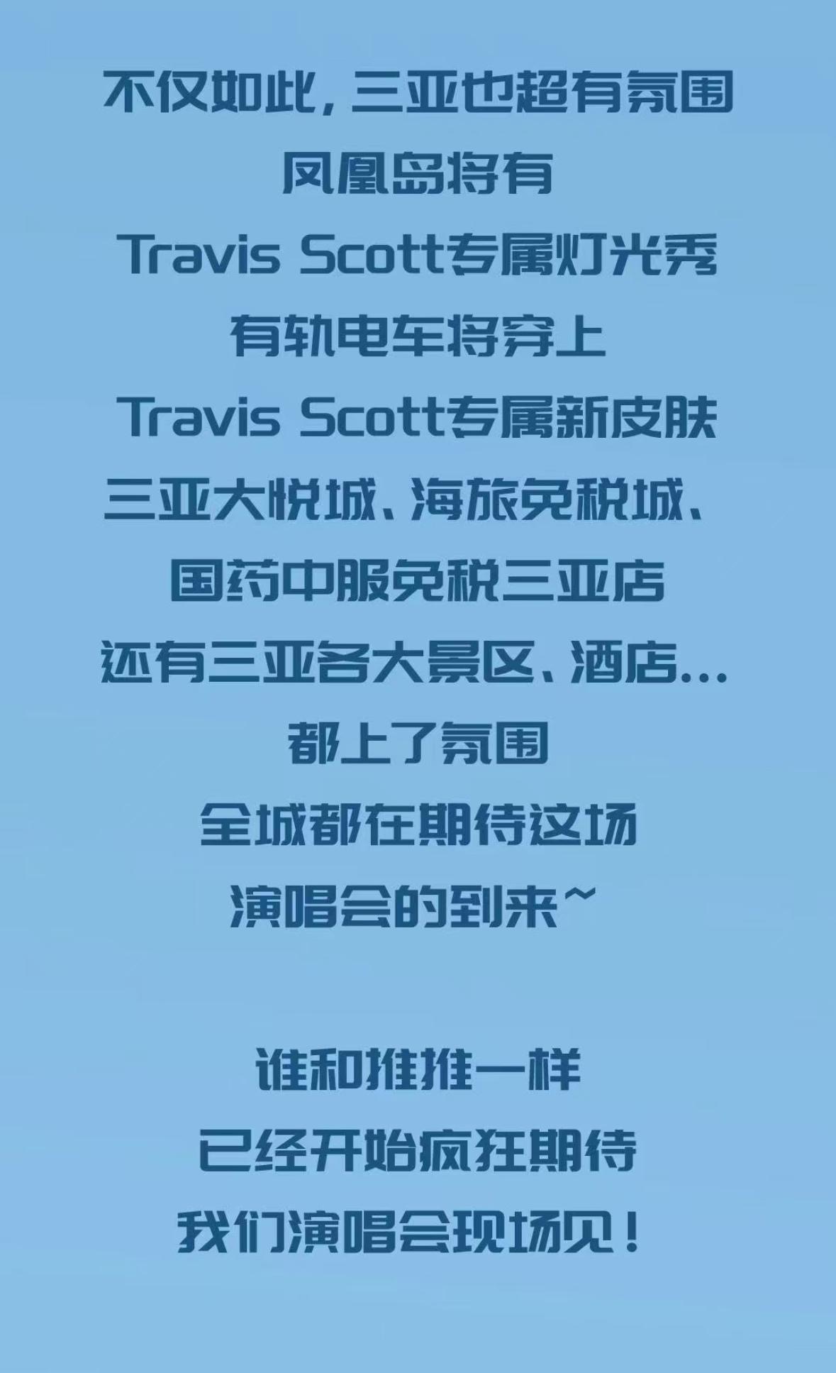 2025特拉维斯·斯科特‘马克西穆斯竞技场’亚洲巡演 三亚站”演唱会将于11月1日在三亚市体育中心白鹭体育场开演啦!赶紧买机票飞三亚! 三亚早已备好"宠粉大礼":持门票可享南航进出港航班折上折,十余家酒店推出专属折扣、延迟退房和免费接驳,甚至还有游艇出海、温泉水疗等限定福利。不过要注意,11月1日14时起体育场周边道路将实行交通管制,建议优先选择公共交通前往,把更多精力留给现场的躁动。
