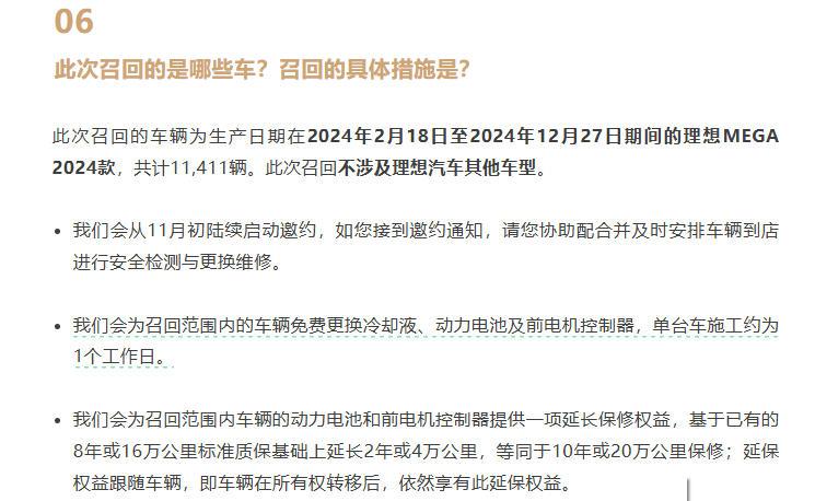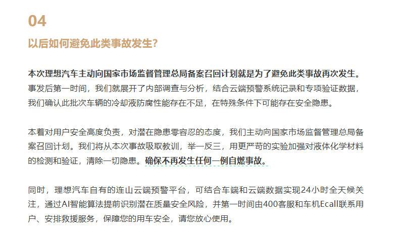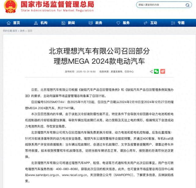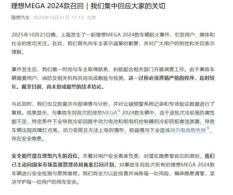 【理想回应MEGA起火事件,并将召回MEGA 2024款】日前理想汽车主动向国家市场监督管理总局备案了召回计划,表示将召回2024年2月18日至2024年12月27日期间生产的理想MEGA 2024款车型,并将对召回车型进行安全检测与更换维修。 同时理想汽车还对此前一MEGA起火事件进行了回应,理想汽车表示,与事故车同批次的理想MEGA 2024款车辆中,由于该批次冷却液防腐性能不足,特定条件下会导致冷却回路中动力电池和前电机控制器的冷却铝板腐蚀渗漏,导致车辆出现故障灯点亮、动力受限及无法上电的情形,极端情况下会造成动力电池热失控,存在安全隐患。 需要指出的是,理想汽车同时表示今后将确保不再发生任何一例自燃事故,并向车主和用户表示歉意。【来自懂车帝车友圈】