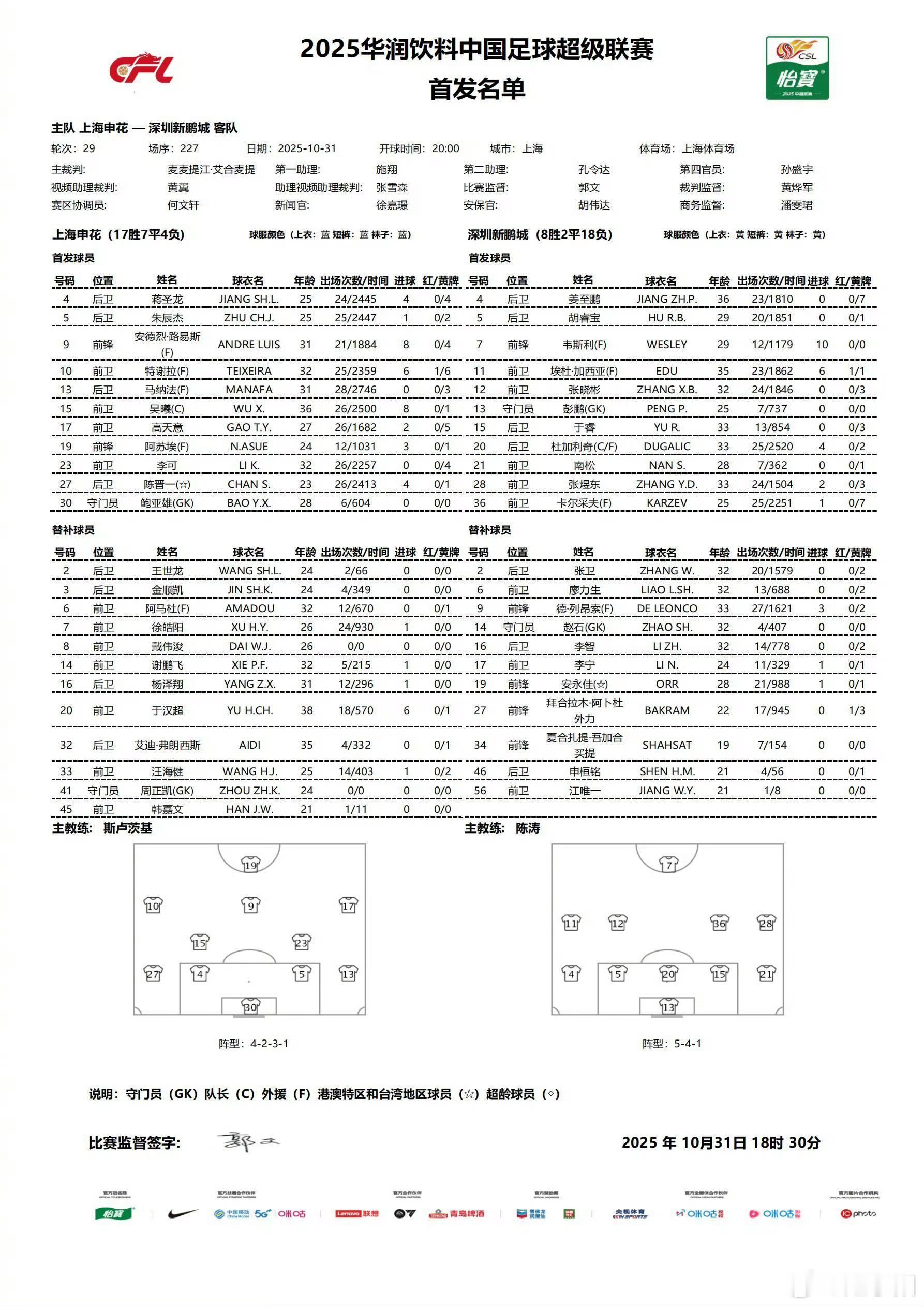 申花首发四外对深圳首发四外,申花门将位置鲍亚雄首发。