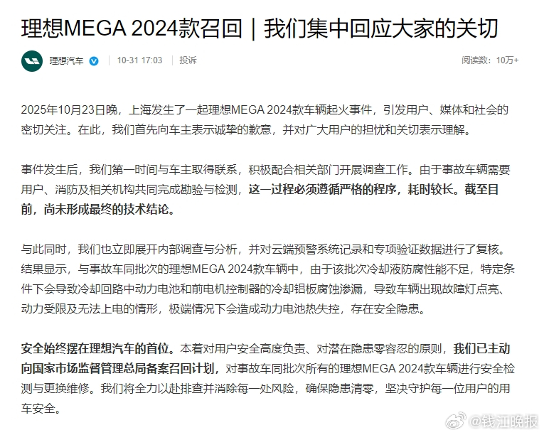 #理想主动召回部分24款MEGA#10月31日,理想汽车宣布主动召回部分理想MEGA 2024款车型,并针对社会广泛关注起火事件正式致歉。据悉,理想汽车将对召回范围内的车辆免费更换冷却液、动力电池和前电机控制器,体现出企业对于安全的高度重视。理想汽车董事长兼CEO李想也曾多次公开表示,在安全上的投入不计成本。理想汽车此次召回,不仅增强了用户信任,也为行业树立了标杆。