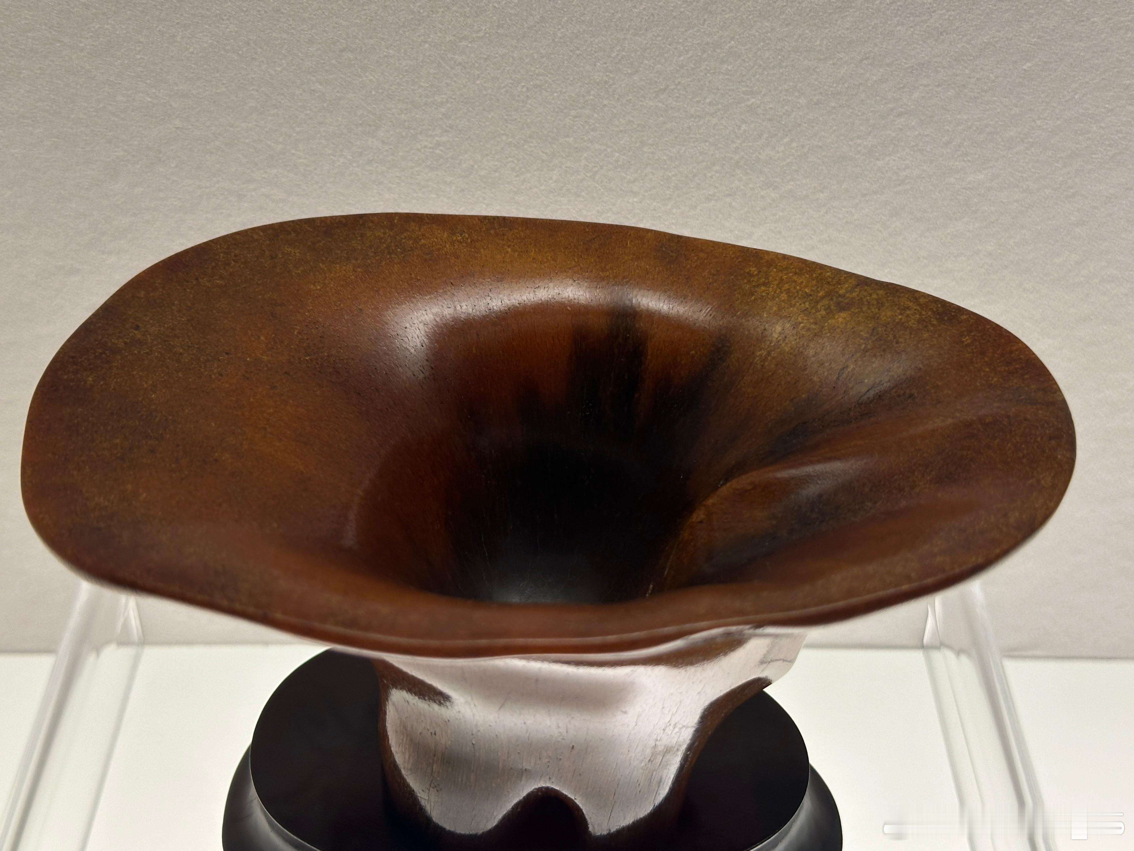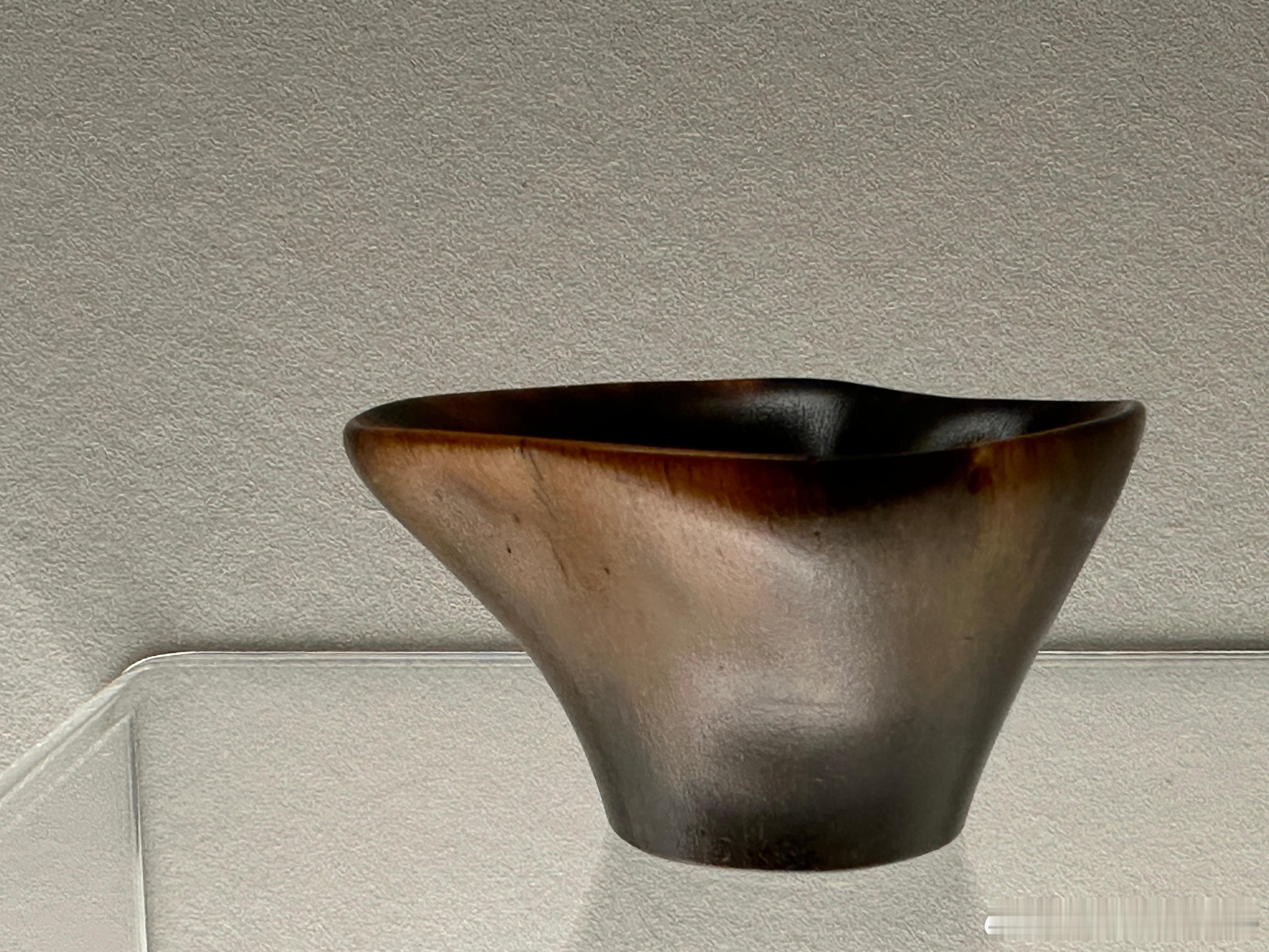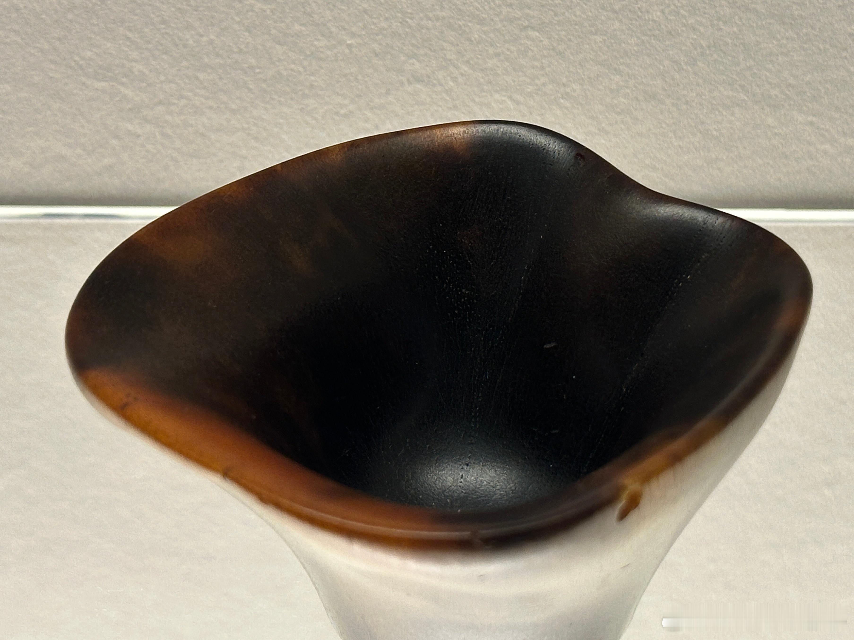 光素犀角器最大限度地保留了犀角的原形,多为随形制作,仅对犀角进行简单的切割、打磨,如犀角雕随形光素杯,仅锯去角尖,口沿磨平,外壁不作任何修饰。简洁的线条和自然的形态,符合中国传统文化中“天人合一”的审美观念。
