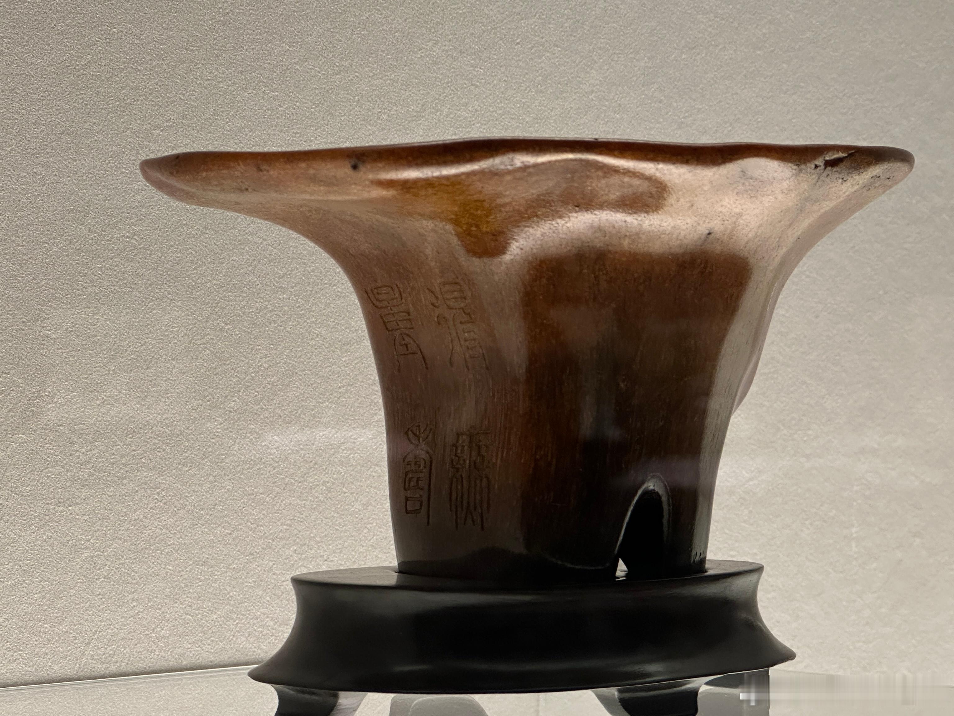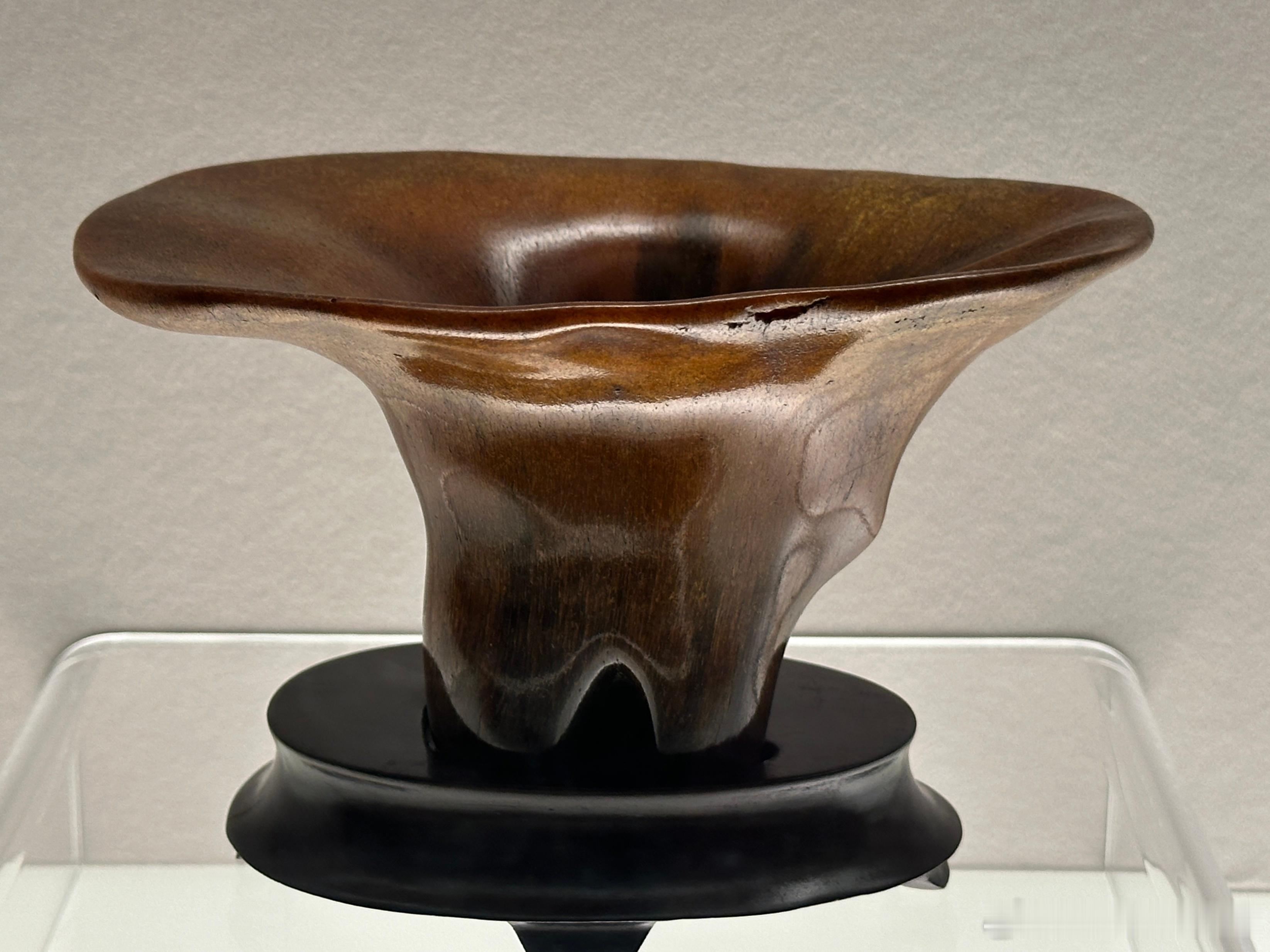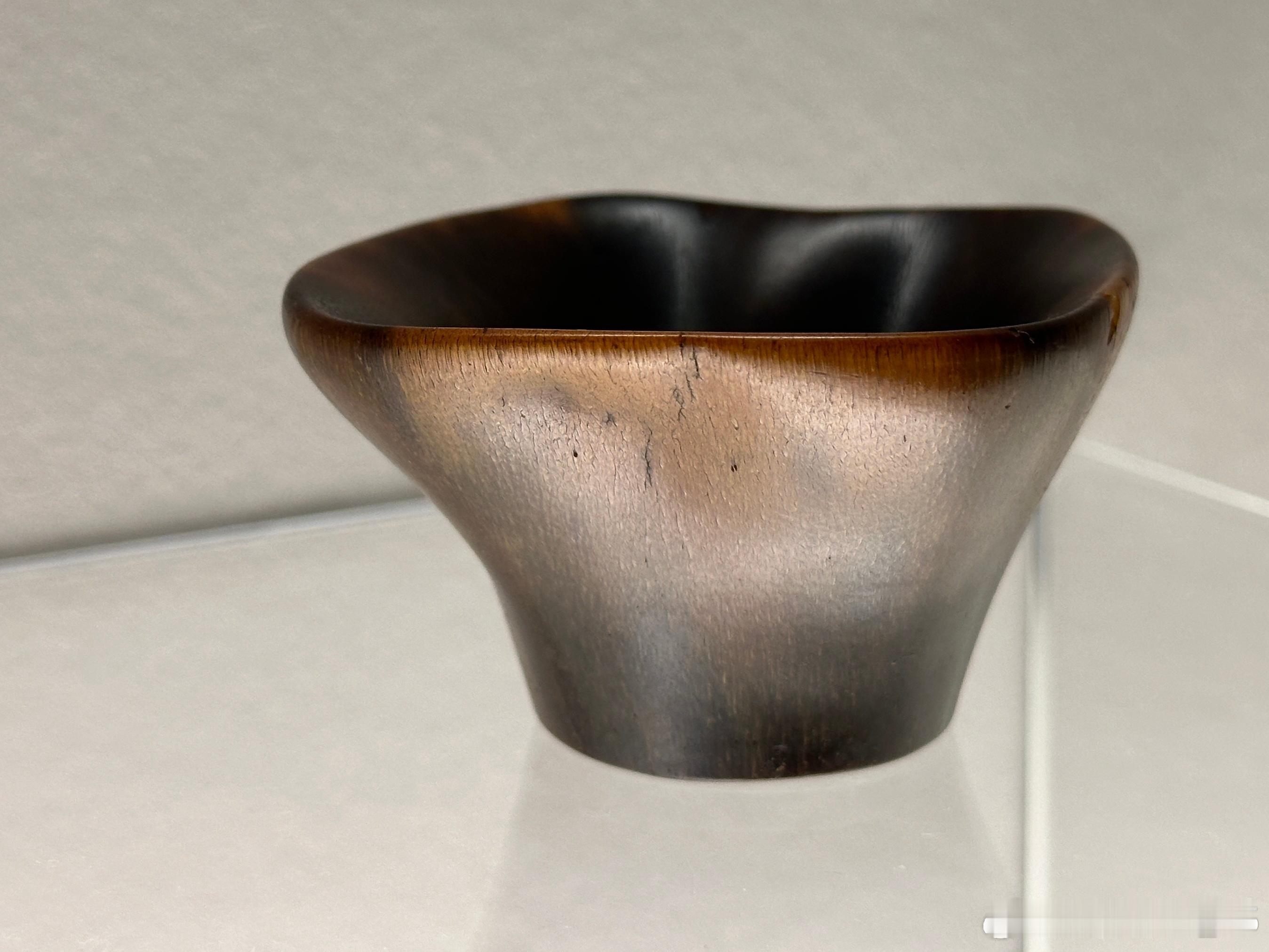 光素犀角器最大限度地保留了犀角的原形,多为随形制作,仅对犀角进行简单的切割、打磨,如犀角雕随形光素杯,仅锯去角尖,口沿磨平,外壁不作任何修饰。简洁的线条和自然的形态,符合中国传统文化中“天人合一”的审美观念。