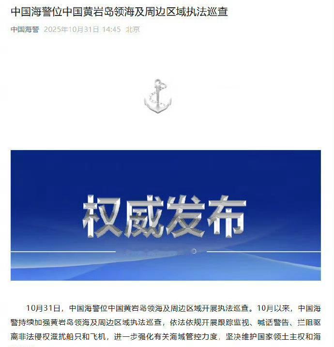 10月31日,中国海警位中国黄岩岛领海及周边区域开展执法巡查。10月以来,中国海