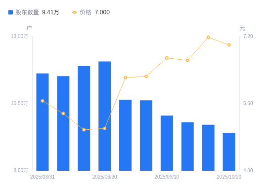 日期A股户数(户)流通A股户均持股数(股)户均持股市值(万元)2025-10-209408328523.5219.972025-09-309715427621.9019.832025-09-199805227368.8918.152025-09-1010054526690.2917.862025-08-2010623925259.7915.792025-07-3110642425215.8815.682025-06-3012069422234.5311.142025-06-2011898622553.7011.222025-04-3011523623287.1412.492025-03-3111628223077.6713.07