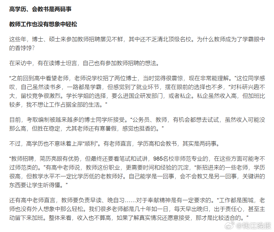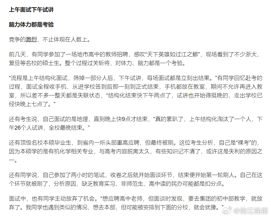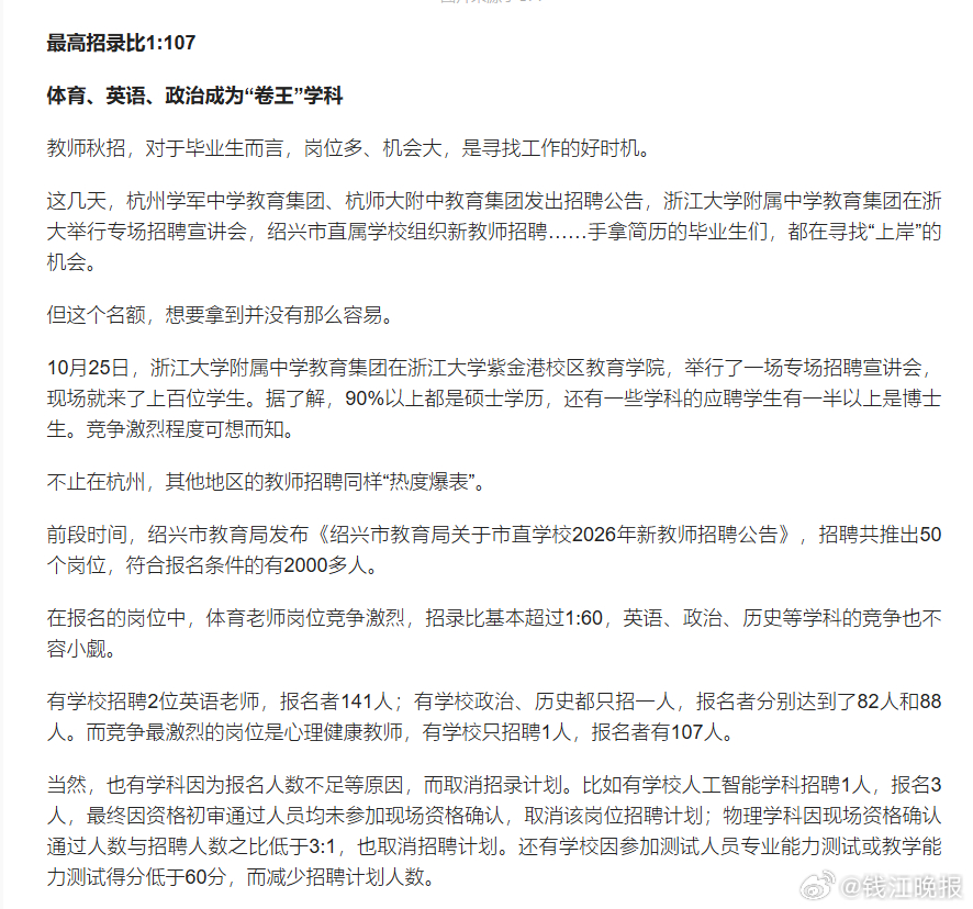 【#教师秋招有学校90%是硕士应聘#】#教师秋招体育英语政治成卷王学科# 这段时间,秋高气爽,各地教育局和学校面向应届毕业生集中招聘教师的黄金期也如期而来,绍兴、镇海等地陆续组织教师招聘专场,杭州多所高中也发布招聘信息。