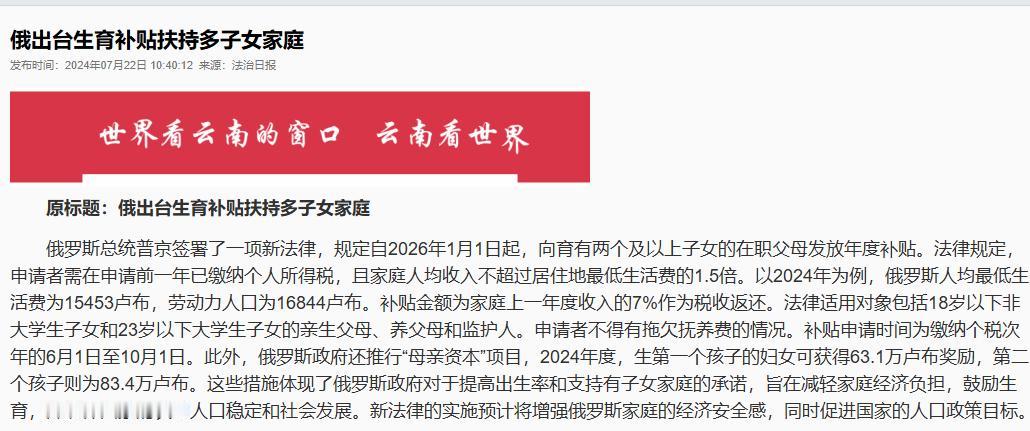 最近战斗民族的生育政策直接炸翻全网,总统普京开大会时放话,以后俄罗斯家庭生三个及以上孩子得是常态,但让人没想到的是,为了让大家愿意多生娃,俄罗斯竟直接甩出“钞能力+超强福利”,这波操作简直卷到飞起。 谁能想到敢打敢拼的俄罗斯,现在最头疼的是“人不够用”,2024年出生人口才122.2万,创下24年来的最低纪录。 大家印象里俄罗斯是敢打敢拼的战斗民族,可再硬的底气也架不住“人不够用”。从2018年到2023年,俄罗斯常住人口从1.45亿跌到了1.43亿,7年就少了160万,相当于每天都有3所学校因为没人而关门。 而且劳动力早就不够用了,现在俄罗斯的失业率跌到2.9%的历史低点,看着是好事,实则是没人干活的无奈,制造业光缺口就有66万人,农业还缺20万人,不少工厂机器转不起来,只能缩减产能。 莫斯科周边的汽车零部件厂,去年就因为招不到工人,把生产线从三班倒改成了两班倒,交货期拖长了近一个月。连远东的农业合作社都急得跳脚,每年春耕都要从中亚找临时工,不然大片土地只能荒着。 这还不算完,55岁以上的人口已经占了总人口的三分之一,2046年老年人比例还要涨到27%,现在每1000个劳动人口要养471个退休人员,再过二十年就得养468个,养老金池快撑不住了,这也是为啥2018年非要把退休年龄推迟到男65岁、女60岁,实在是没人交钱了。 人口少了,地方先扛不住,哈巴罗夫斯克边疆区上半年新生儿比去年少了309个,只能给生孩子的女大学生发10万卢布补贴,车里雅宾斯克州更狠,直接给到100万。 远东七个地区更急,生三个以上孩子直接给100万卢布还贷款,买国产车能享25%的首付折扣,这哪是补贴,简直是求着年轻人多生。 全国层面的福利也跟着加码,2025年起生第一个孩子给67.7万卢布,第二个给89.4万,家里有两个以上孩子的父母,还能拿上一年收入7%的税收返还,前提是家庭收入没超过当地最低生活费的1.5倍。 甚至立法禁止宣传无子女思想,违者最高罚40万卢布,官员翻倍,这波操作连“思想管控”都用上了,足见有多焦虑。 其实俄罗斯早试过催生,之前的“母亲资本”项目给了不少补贴,但效果越来越差,从每年出生近200万跌到122万,7年人口少了160万。 说白了,年轻夫妇不是不想生,是生不起,莫斯科的蔬菜价格涨得离谱,央行把利率提到16%都 压不住通胀,养个孩子从奶粉到教育都是钱,没点真金白银的支持,谁敢多生? 而且最现实的是劳动适龄人口还在减少,预计到2046年要比2023年少370万,经济发展部算过账,到2030年得补230万人,一半靠自己人,一半只能靠移民和提高生产率。可移民每年得净流入39万才能稳住人口,这哪是容易事。 俄罗斯经济现在靠军工拉动,民用产业下滑,说到底还是没人搞生产、没人消费。 边疆地区村庄一个个消失,工厂招工牌挂半年,这些不是数字,是实实在在的困境。普京喊“三孩成常态”,不是要逼谁,是真怕再过几十年,这么大的国家连种地、做工、守边疆的人都凑不齐。 那些补贴看着豪气,其实是给年轻家庭的“定心丸”,也是给国家未来的“续命钱”。 看似卷到极致的福利政策,藏着的是战斗民族“没人撑家”的心酸。从1.48亿到1.43亿的人口下滑,从近200万到122万的新生儿锐减,背后是劳动力断层、养老承压、边疆空虚的连锁反应。 真金白银的补贴能不能起效不好说,但对俄罗斯而言,每个新生命都不只是家庭的希望,更是撑起产业、延续文明、守好家国的“未来基石”。毕竟再强的底气,也得有人才能托得起来。