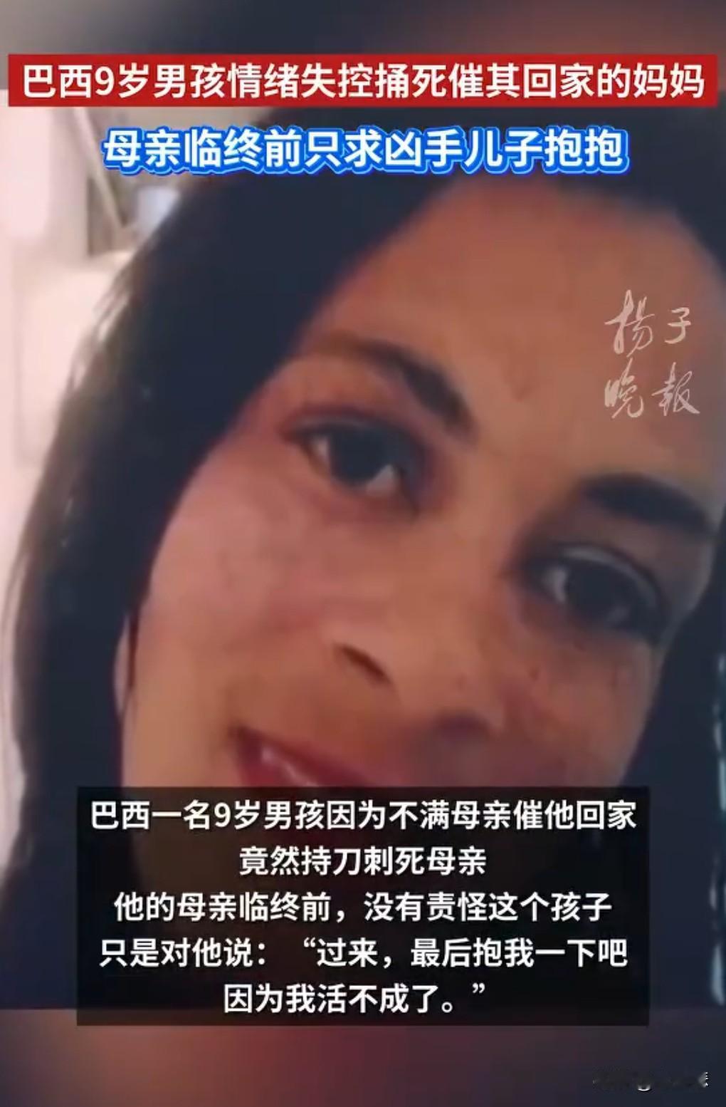 如果不是在网上亲眼所见,我是万万不敢相信,一个母亲竟然会如此爱自己的孩子。 10月31日在网上看到这么一个事情。 巴西9岁男孩捅死母亲,只因为母亲催他回家。 这男孩实在是太疯狂了。 那么小这么残忍。 而这位母亲临死前仅要求孩子抱抱她,因为她活不成了。 这个时候还要孩子抱抱她,真是太爱自己的孩子,感觉平时应该很溺爱孩子。