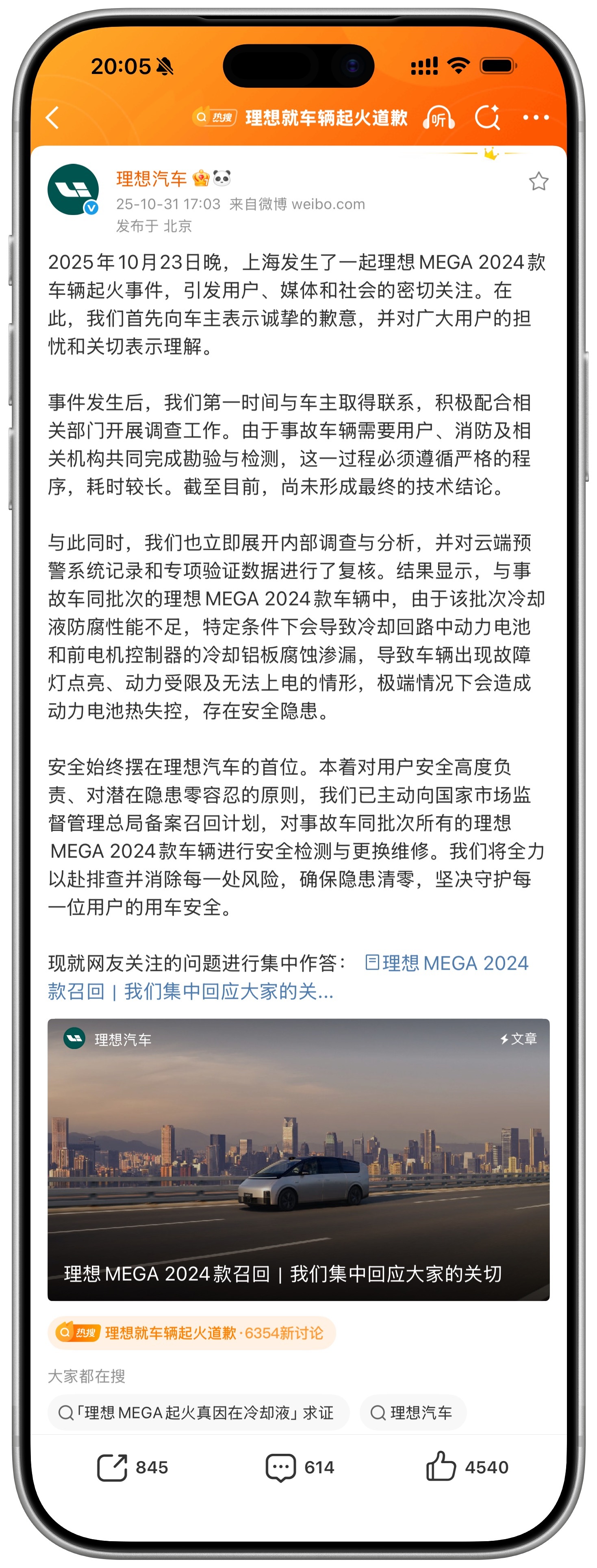 理想就车辆起火道歉理想承认存在安全隐患,就车辆起火进行了道歉,现召回2024款Mega。