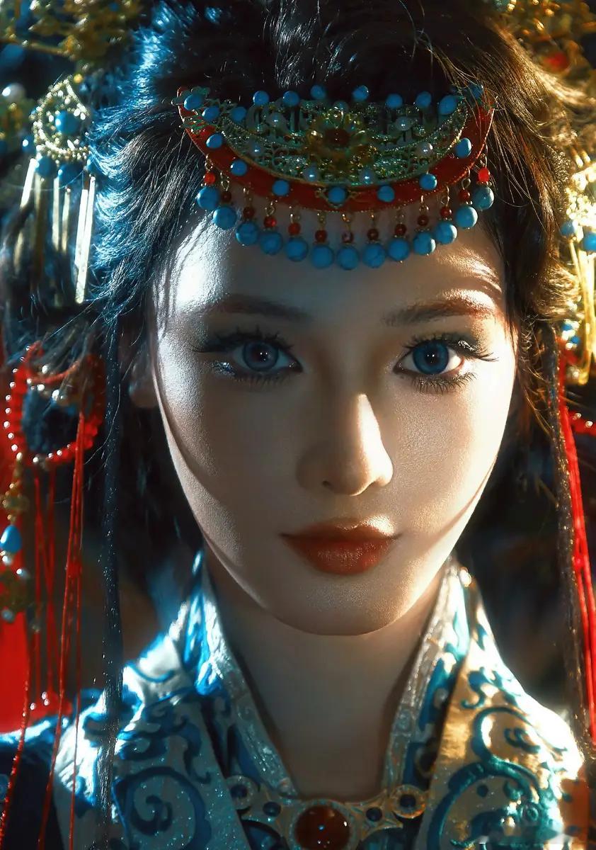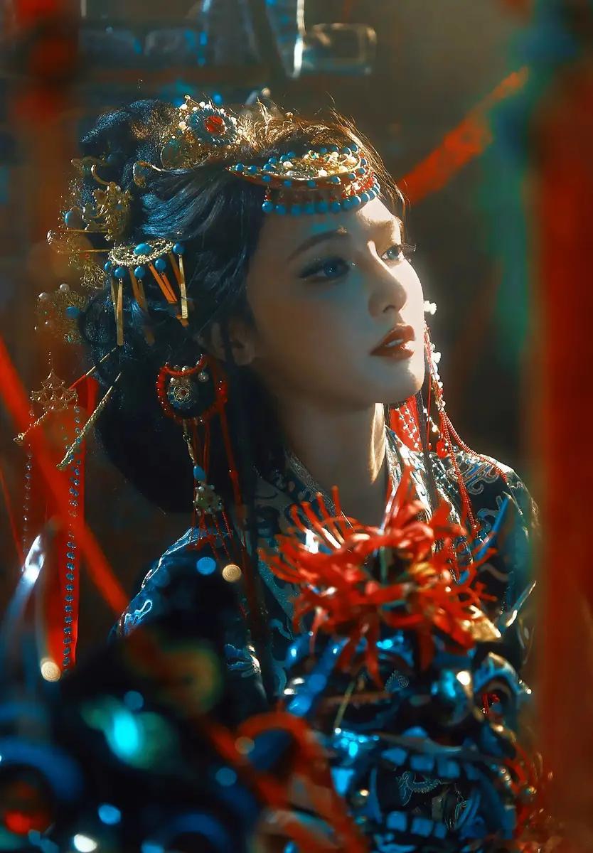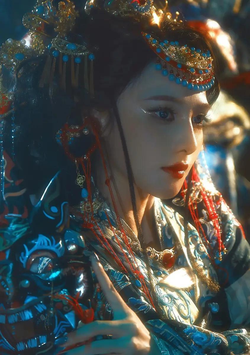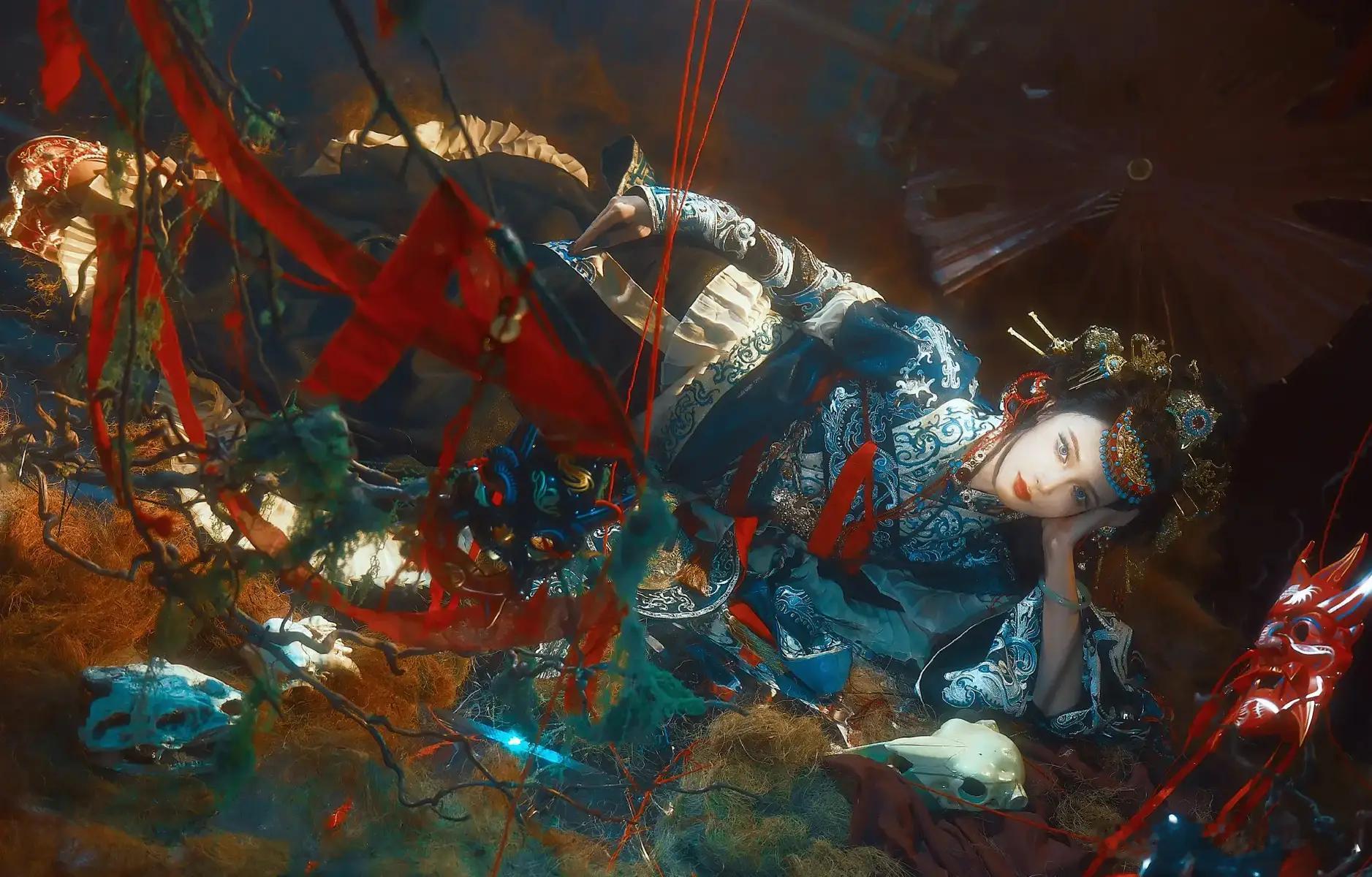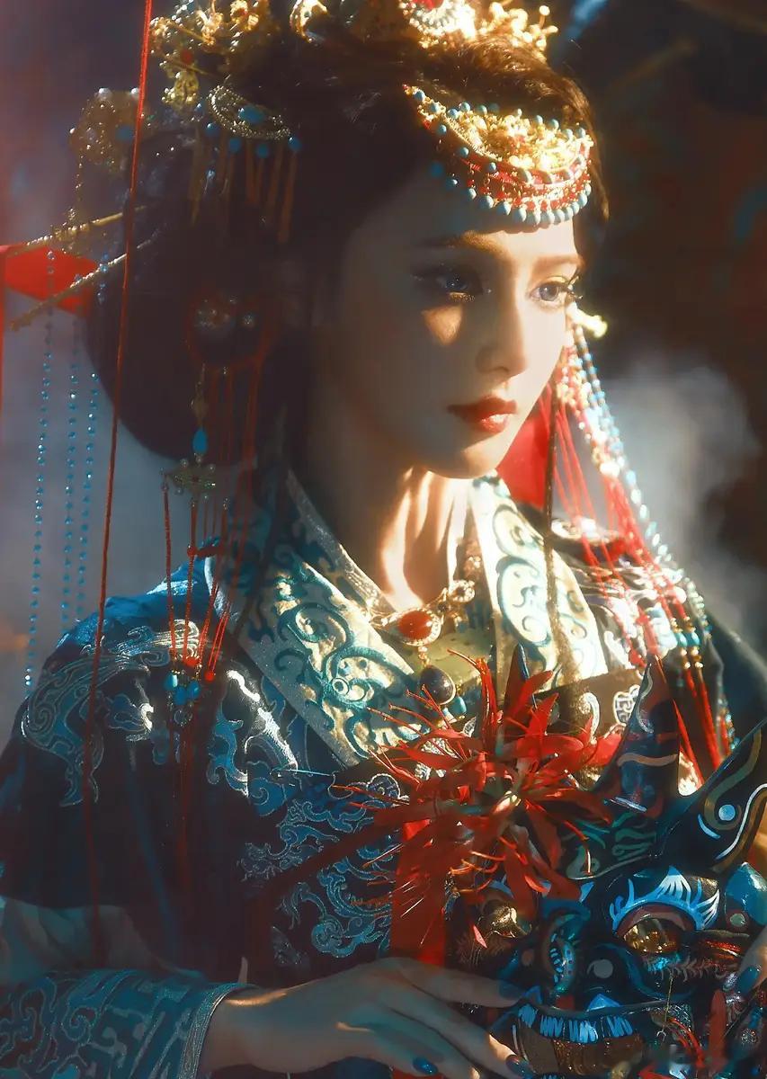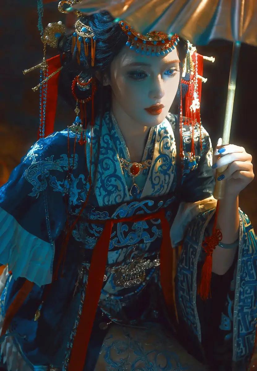 31日,彭小苒分享了一组傩戏为灵感的美图。图中,她手持油纸伞,妆容华丽,眼神深邃。