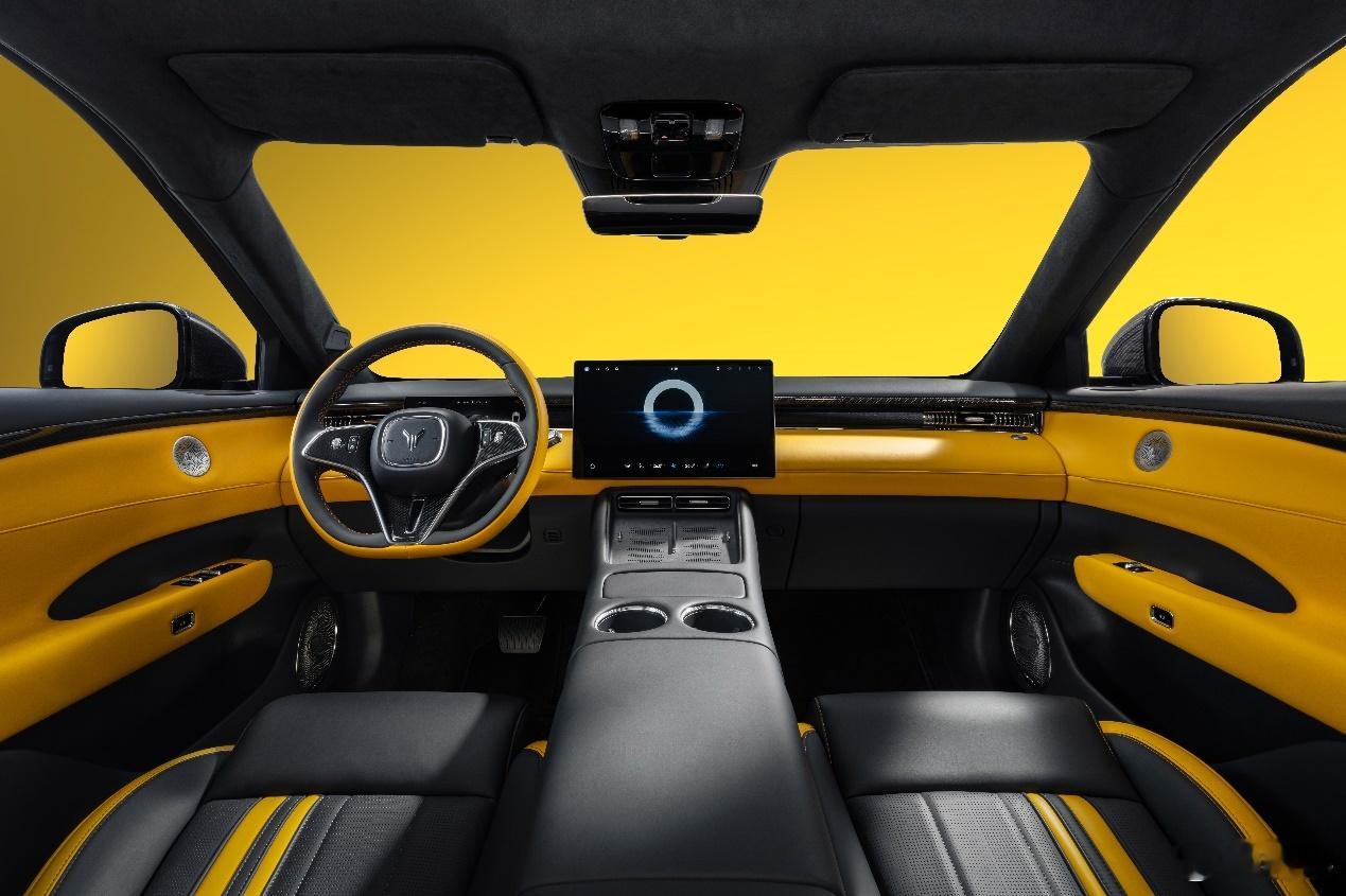 内饰是玄金双拼撞色,方向盘、座椅这些地方都用了黄色包覆,搭配仿麂皮材质,看着挺有激情。