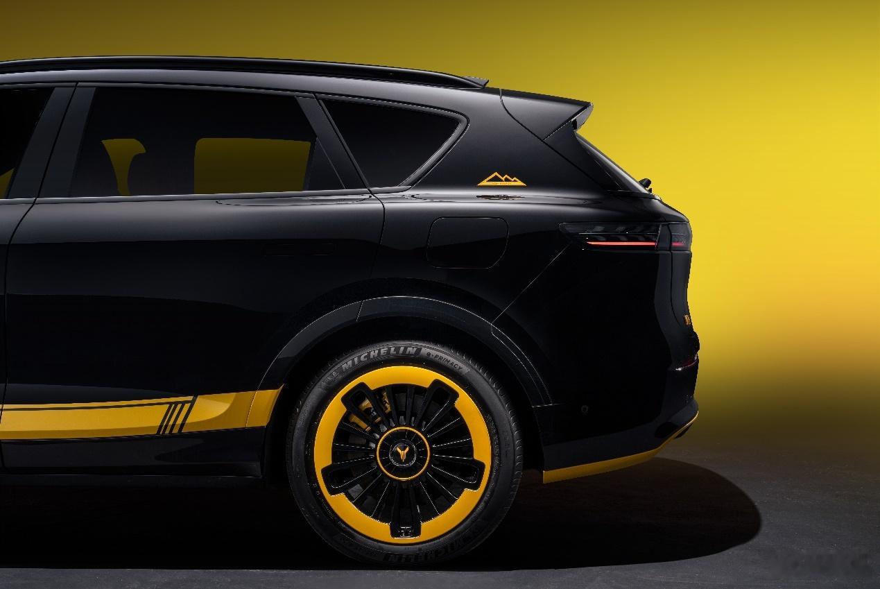 带了专属的「暗影流光」套件,车漆停着的时候看着深邃神秘,开起来会有流光变幻的效果,引擎盖和车门还有亮黄色拉花,20寸轮毂配黄色卡钳,运动感拉满,尾翼和专属车标也挺显特别。