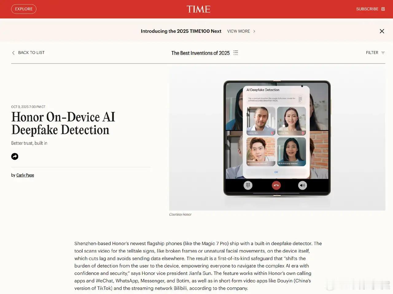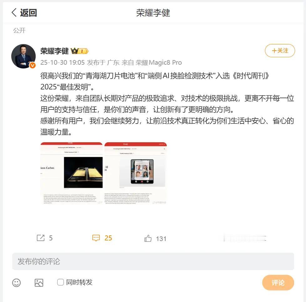 将产品技术做到极致,不断挑战技术极限,并将这些前沿技术应用于日常生活,提升用户体验。令人惊喜的是,荣耀有两项技术入选了《时代周刊》2025年最佳发明榜单: 1青海湖刀片电池:不仅让手机更轻更薄,还有效保证了续航表现,同时耐热抗寒能力也显著提升。 2 端侧AI换脸检测技术:让用户在使用手机进行视频聊天时更不易受骗,人脸验证与支付过程也更加安全。 对此,荣耀CEO李健表示感谢大家的支持,未来将继续致力于为用户创造有价值的产品。