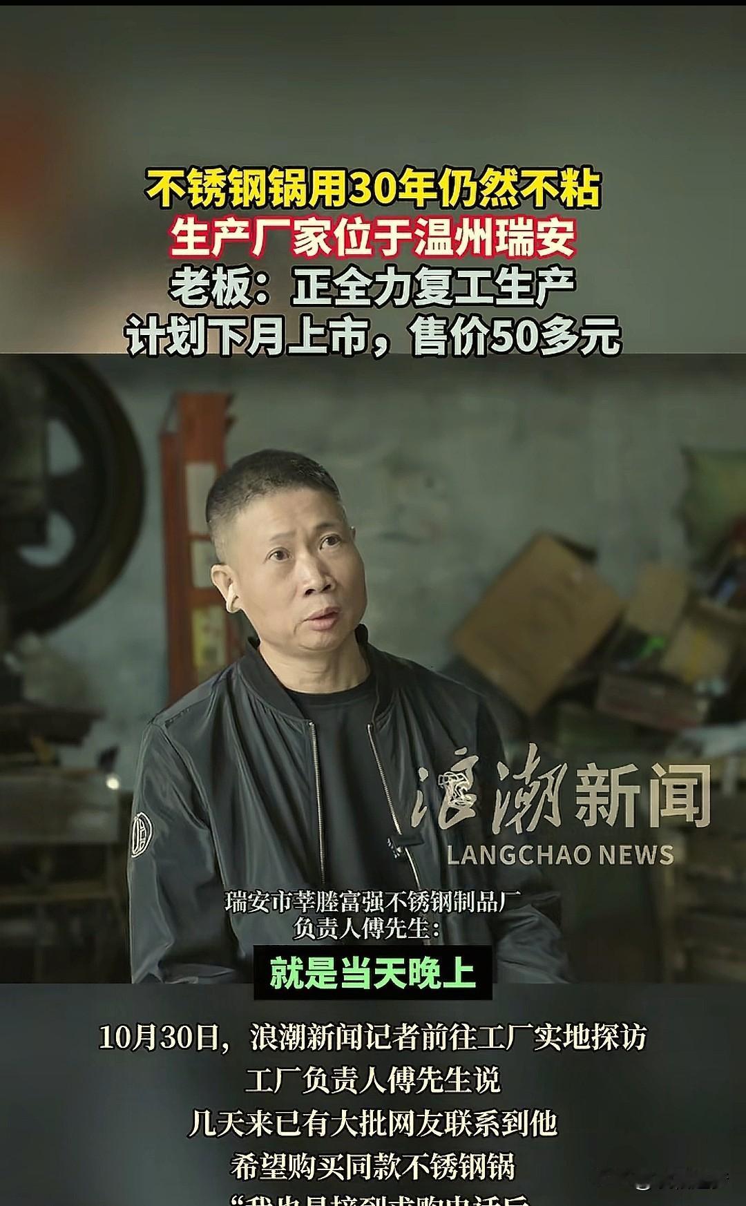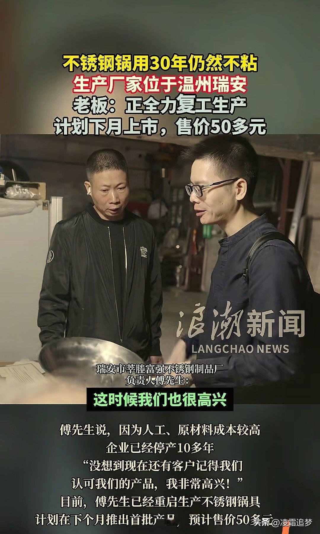 好消息!女子用了30年不锈钢锅的厂家有发声了!网友呼声高,厂家准备复产,老板决定:比原来的锅底更厚,用料更好,售价大概在五六十元左右! 事情的起因是前几天,一名女子家里花30元买了一口炒锅用了30年,不生锈也不粘锅,但是锅底有点变薄想买一个同款,结果找了整条街也没找到,上网求助才得知厂家早就不干了。 没想到,视频一下子火了,原来的老板恰巧也看到了,这实惠的性价比,过硬的质量,让网友纷纷表示,只要重新 生产都想买一个试试看! 老板一下子有了信心,新闻记者找到这位朴实的手艺人时,他不藏着不掖着坦然说道:由于原材料上涨,10多年前经营不下去停产了,但是设备还保留着,争取一个月复工生产,把原来0.8毫米的锅底增加到1.1毫米,增加耐磨度。 网友们听到消息,在评论区纷纷留言。 有人说:这种不锈钢锅真的不错,即不沾也不锈,还在想哪里能买这样的锅,结果就来了! 也有人说:这么牛的锅。到时候我也要买一个。如果真保质保量200都可以,现在每年换一锅,不是粘锅就掉漆,感觉特别不耐用。 还有人说:不用进步,最 好完全一模一样!现在就很好了! 有这样实诚的老板,这样过硬的手艺,何愁不会大卖呢?也许真的只是时间问题,这不,泼天的富贵冲着老板就来了!这样的生意人就应该火起来! (来源:浪潮新闻)