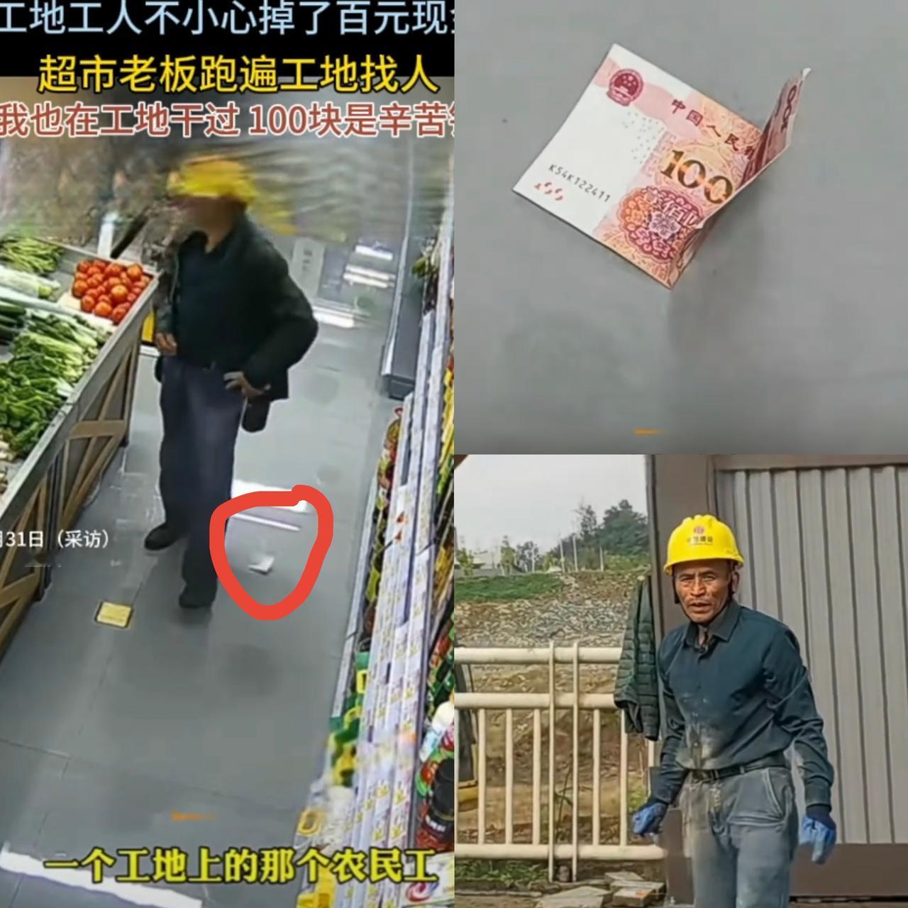 重庆农民工在超市掉100元钱, 最让人感动的,不是老板找遍所有 工地还钱。而是这位超市老板的,内心懂工地大哥会因为掉钱而心疼! 前两天在重庆渝北,一位农民工大哥在超市购物时,不小心把一张百元钞票掉在了地上。等他发现钱不见后,急得整晚都没睡好觉——这可是在工地搬砖扛水泥,不知流了多少汗水才换来的辛苦钱。 超市老板捡到钱后,二话不说就跑遍附近工地寻找失主。“我也在工地干过,知道这100块钱对他们意味着什么。”老板说这话时语气诚恳,可能是烈日下几个小时的暴晒,可能是搬上百块砖头的腰酸背痛,这钱必须还! 最打动人心的,是这份将心比心的理解。他懂得每一分劳动成果的珍贵,懂得底层劳动者挣钱的不易。这种发自内心的尊重,比金子更闪亮。