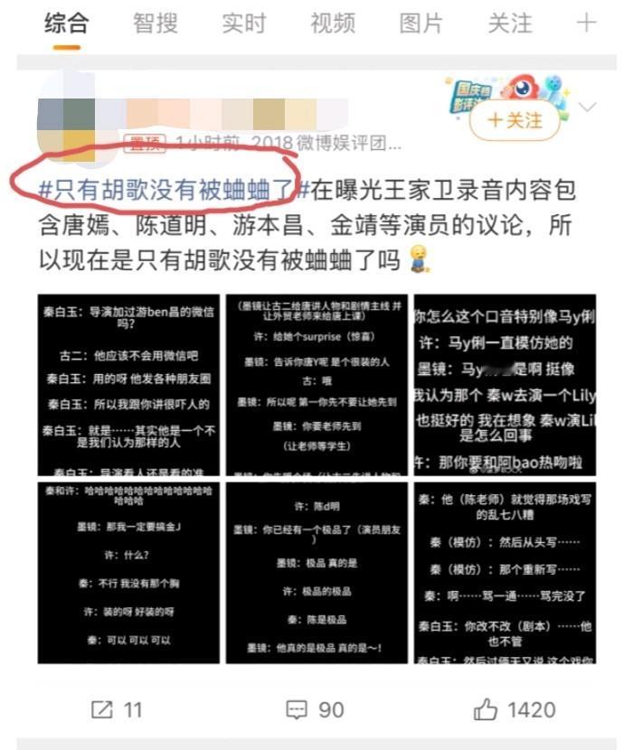 《繁花》主要演员里面只有胡歌没有被蛐蛐了?这个话题一度随着王家卫录音的再次曝光而冲上热搜。而网上关于这个话题的观点更多倾向于“胡歌并不是没有被蛐蛐,而是爆料人要把最大的、最劲爆的留到最后”。 当然,还有几种可能也并非完全排除,比如说胡歌确实没有被蛐蛐,又或者胡歌早就已经花钱免灾了。 现在,已经有好事网友迫不及待的等着吃后续的更大的瓜了! [捂脸][捂脸][捂脸]