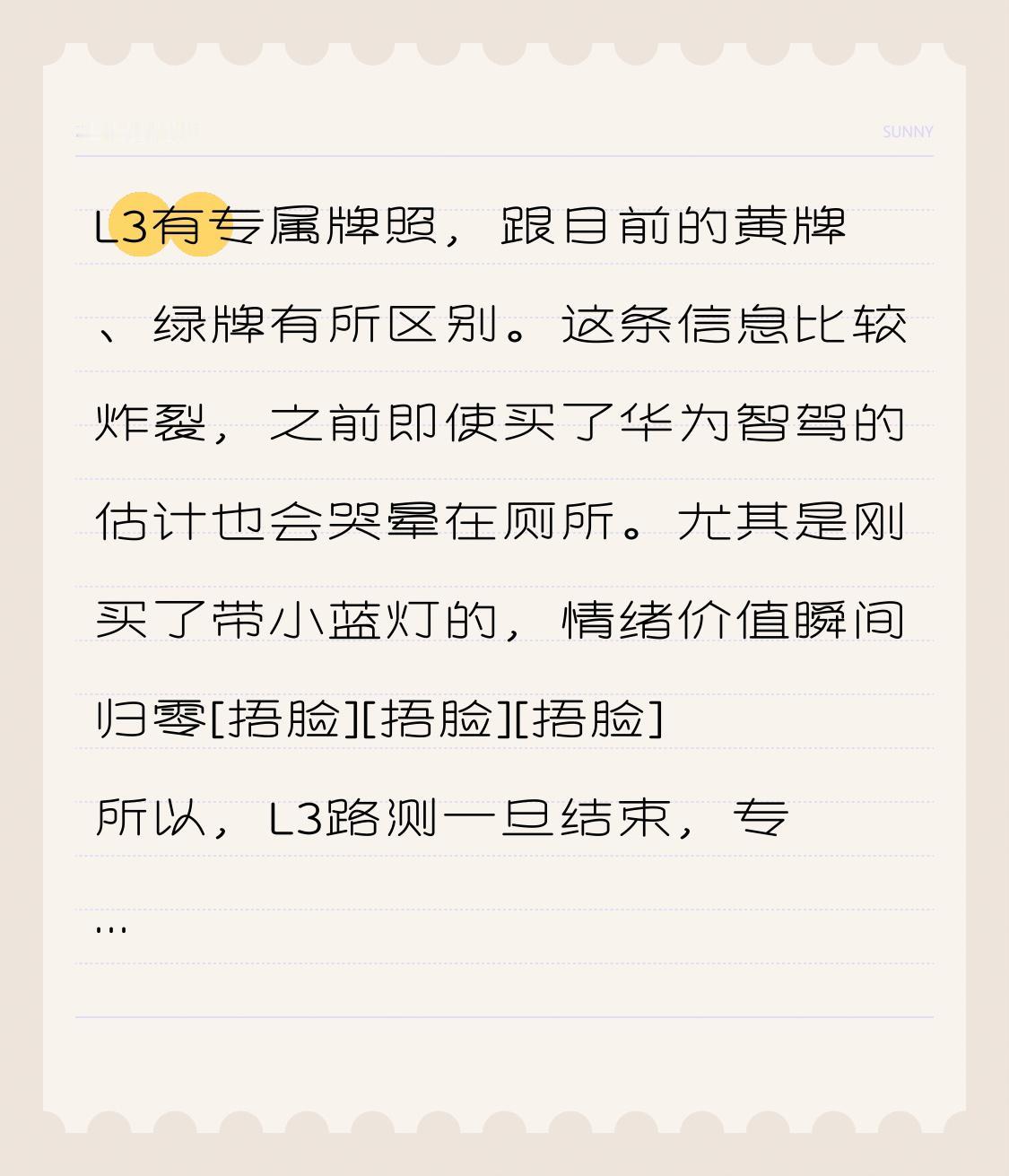 L3有专属牌照,跟目前的黄牌、绿牌有所区别。这条信息比较炸裂,之前即使买了华为智驾的估计也会哭晕在厕所。 尤其是刚买了带小蓝灯的,情绪价值瞬间归零[捂脸][捂脸][捂脸] 所以,L3路测一旦结束,专属L3车牌带来的情绪价值是无敌的,到时候又有大批人去换购。 另外就是L3的测试普通人是没有机会的,主要面向一些专业机构和公司。 测试路段也有限制,某个区域或者干脆就是某一条路。