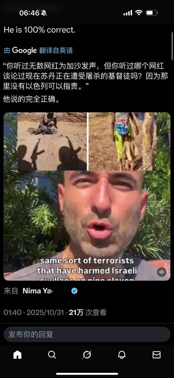 “你听过无数网红为加沙发声,但你听过哪个网红谈论过现在苏丹正在遭受屠杀的基督徒吗?因为那里没有以色列可以指责”