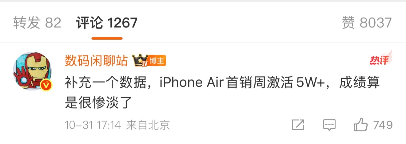 iPhoneAir激活量曝光 掺淡意料之中,但是没想到iPhone Air首周激活量只有5W+台。[捂嘴哭]