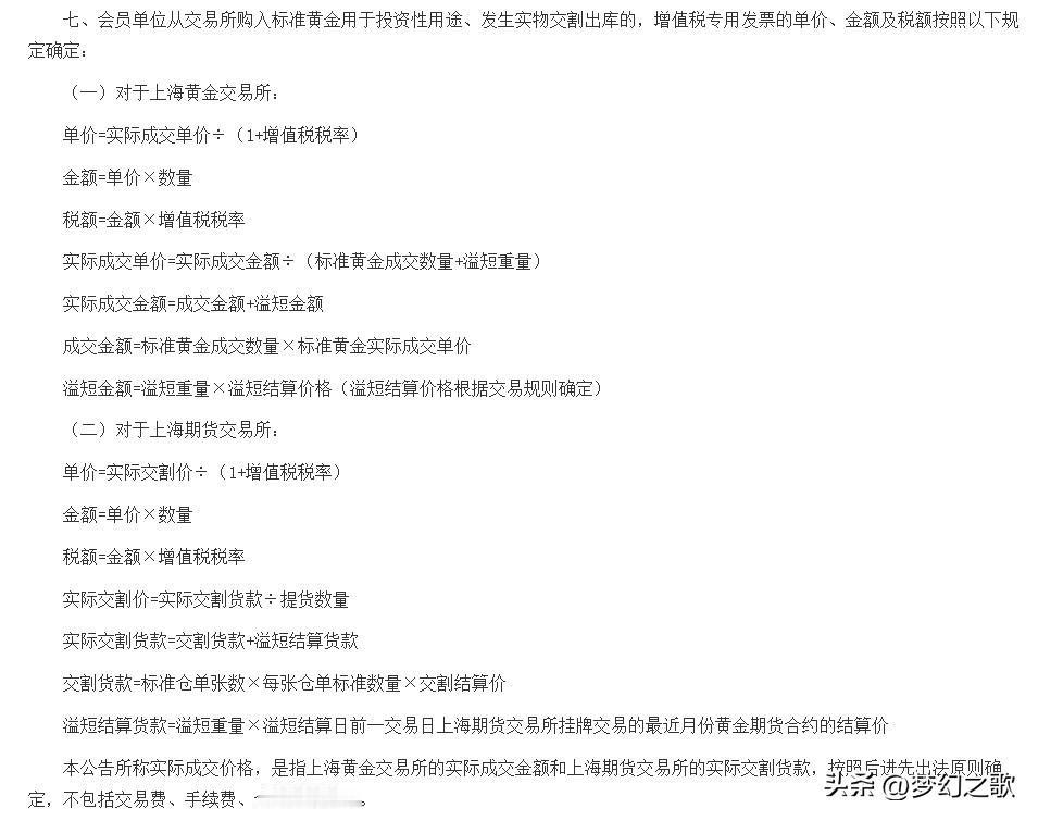 大消息,黄金要交税了,手里现在还有黄金的要难受了 最新规定,不是在正规交易所购买的黄金,销售要交增值税。 这句话的意思就是:不是通过上海黄金交易所、上海期货交易所等正规交易所进行,那么就需要按照现行的增值税相关规定来缴纳增值税,税率是13%。 大多数投资者都是从银行购买的黄金,只要涨价了也得交税,也就是说黄金在个人手里变相的贬值了。100万买的黄金,涨到了120万,就要交26000万元的税。 这项规定很明显就是为了给火热的黄金市场降温,周一预计黄金会出现大幅下跌。