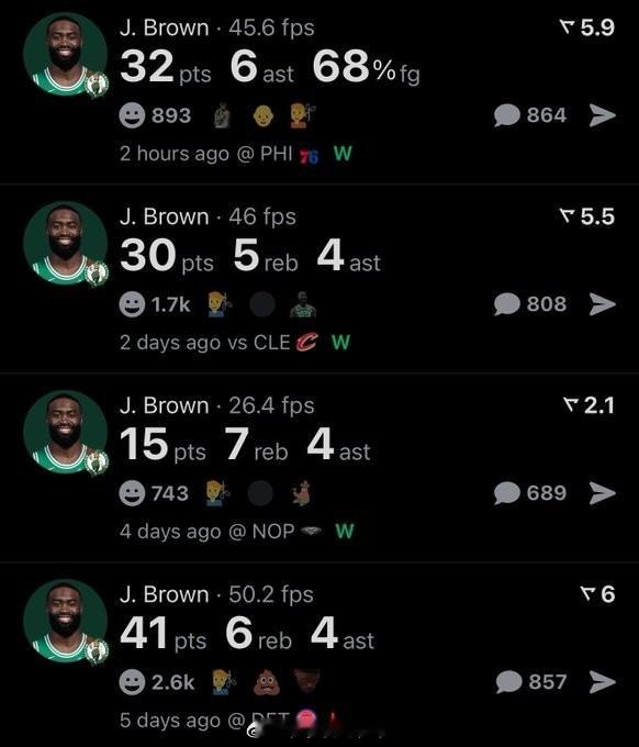😎FMVP实力!杰伦-布朗过去4场比赛,场均轰下29.5分,凯尔特人取得3胜1负。