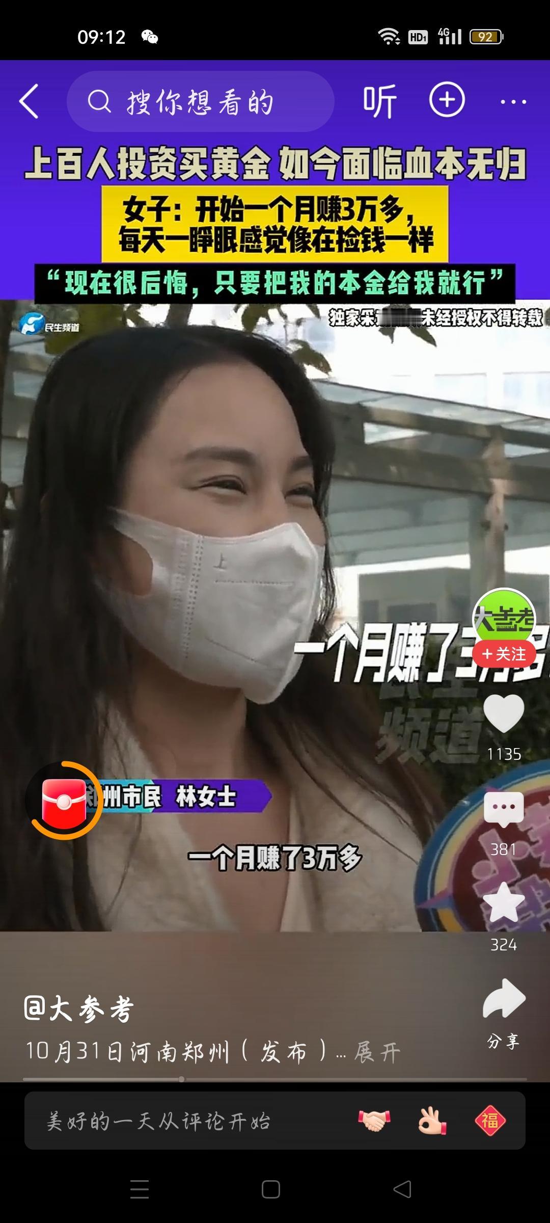 开始像捡钱现在很后悔,我想说 据大参考报道,河南郑州,前几个月黄金暴涨,许多人投资黄金,一女子说,一个月赚三万块钱,每天一睁眼就像捡钱一样,可是到10月20日左右黄金冲高回落,一女子跑到上海,向投资公司要钱,老板说他自己也亏钱,许多人要回本钱,可是本钱也要不到,许多人报警,警方在调查,唉!什么投资都有风险,个人认为,许多人还是缺少风险意识,认为一个月赚几万块钱,以为月月可以赚,太天真了!个人认为,搞投资也要学习,之前总说风险,无人理睬,现在真金白银没了,就上了一堂风险课。各位条友觉得呢?