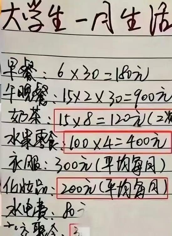 “太心寒了”,大学女生哭诉,父母一个月只给1500的生活费,根本不够。当她晒出生活费清单时,才发现不是所有人都能理解父母 女生在网上抱怨,自己因为生活费不够,常常感到自卑,舍友喝20元一杯的奶茶时,她只能说自己不想喝,大家月底聚餐时,她总是要想方设法地拒绝,不是因为不想参与,而是看着仅剩的余额没了底气。 拿着一月1500元的生活费,抱怨着没底气带来的自卑感,眼泪一掉好像受了天大的委屈一样。 可当大家看到她晒出的消费清单后,才后知后觉有些人是怎样都不会满足的。 女生一个月早餐180元,两顿正餐900元,奶茶一个月120元,水果零食400元,衣服300元,化妆品200元,还有交友聚会等300元。 说实话,按照这样的消费每个月几乎都要花超支,也就能理解她为什么会说1500元不够,明明正常一日三餐,偶尔再加点零食水果,这笔钱绰绰有余。 可化妆品衣服需要每个月都买吗,水果每个月有必要花这么多吗?奶茶需要一周喝两杯吗? 说实话,她现在就是不懂父母赚钱的辛苦,总以为钱伸手就能有,只有她自己外出上班了,才知道一个月能打1500元给父母,到底有多吃力。 工薪家族的父母不容易,供养一个孩子上大学更不容易,咬着牙托举孩子上大学,最后孩子却不理解父母的辛苦,就怕最后还要说一句“逃离原生家庭”。 或许这种道理,也只有等她毕业后,亲自拿过一个月的工资,才明白赚钱的不易吧。