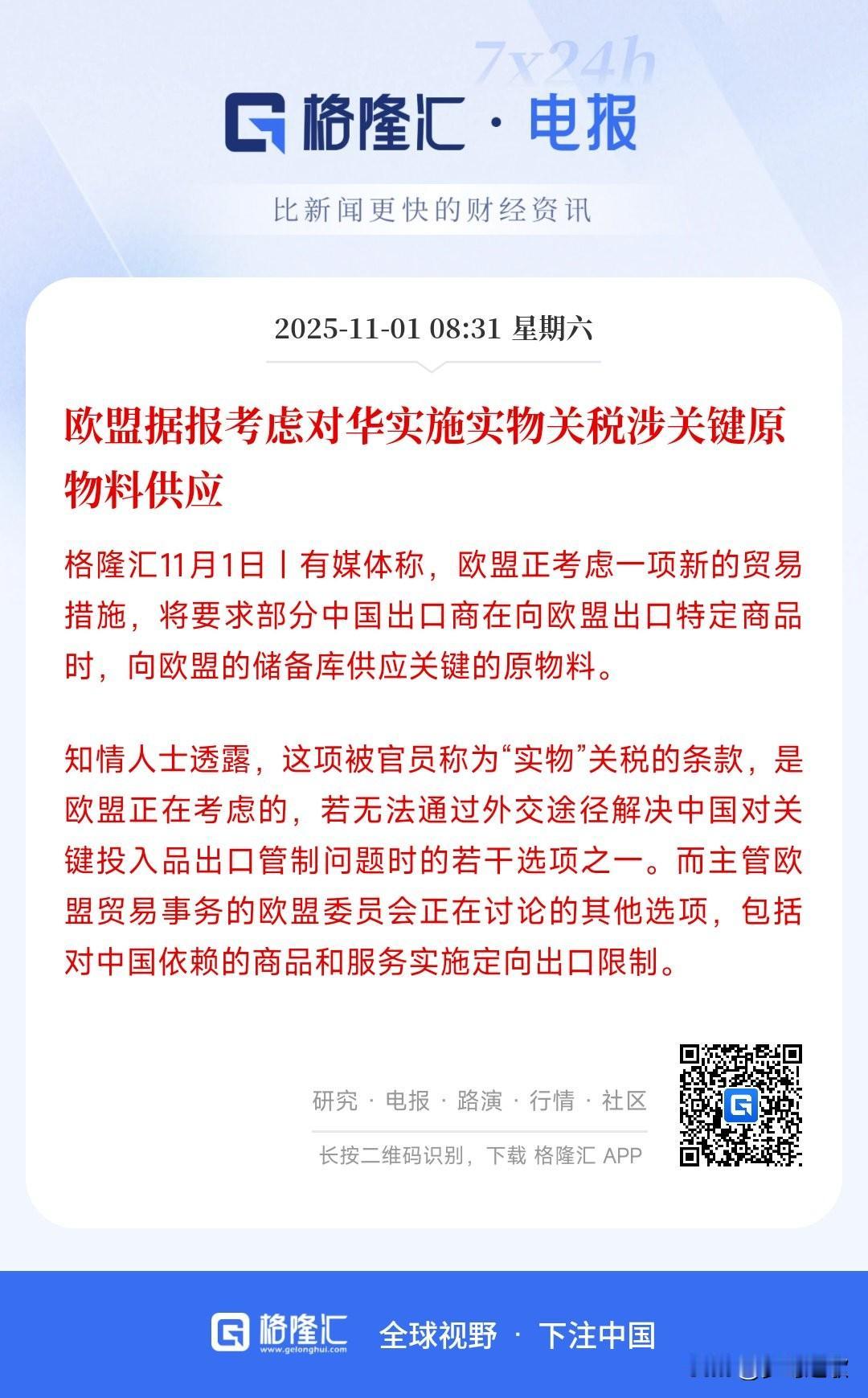 欧盟又出“幺蛾子”,意在中国稀土 欧盟正在考虑一项新的措施:就是中国出售商品给欧盟,要附带商品的关键原材料。 数据显示:2025年1-8月,HS85(电机、电气设备等)和HS84(机器、机械设备)是中国出口欧盟最多的商品,分别出口961.02亿美元和647.85亿美元。 那么电机的关键原材料是什么就不用多说了,就是稀土永磁,欧盟现在急需要大量的稀土来支持欧盟内的制造业。 因为中国每年出口欧盟大量的商品,欧盟是买家,就想通过这种方式来获得自己需要的原材料,不得不说这算盘打得叮当响。